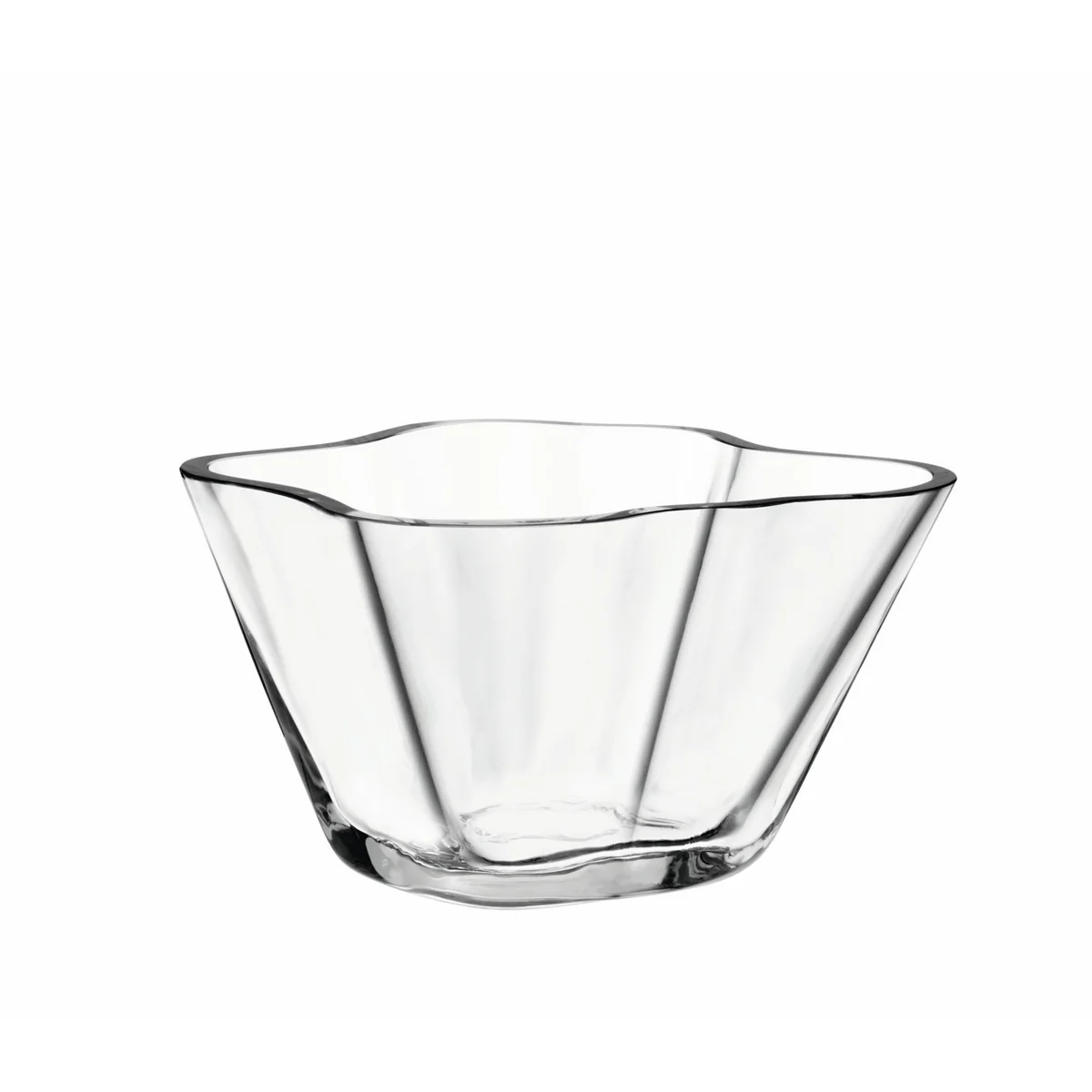De Aalto schaal (75 mm) maakt ook gebruik van deze gebogen vormentaal en wordt daardoor een blikvanger op de eet- of salontafel. Of het nu gaat om het serveren van ijs of desserts, het serveren van kleine hapjes en dipsausjes of gewoon als een decoratief object op zichzelf - de glazen kom is veelzijdig en kan uitstekend worden gecombineerd met andere producten uit de collectie.