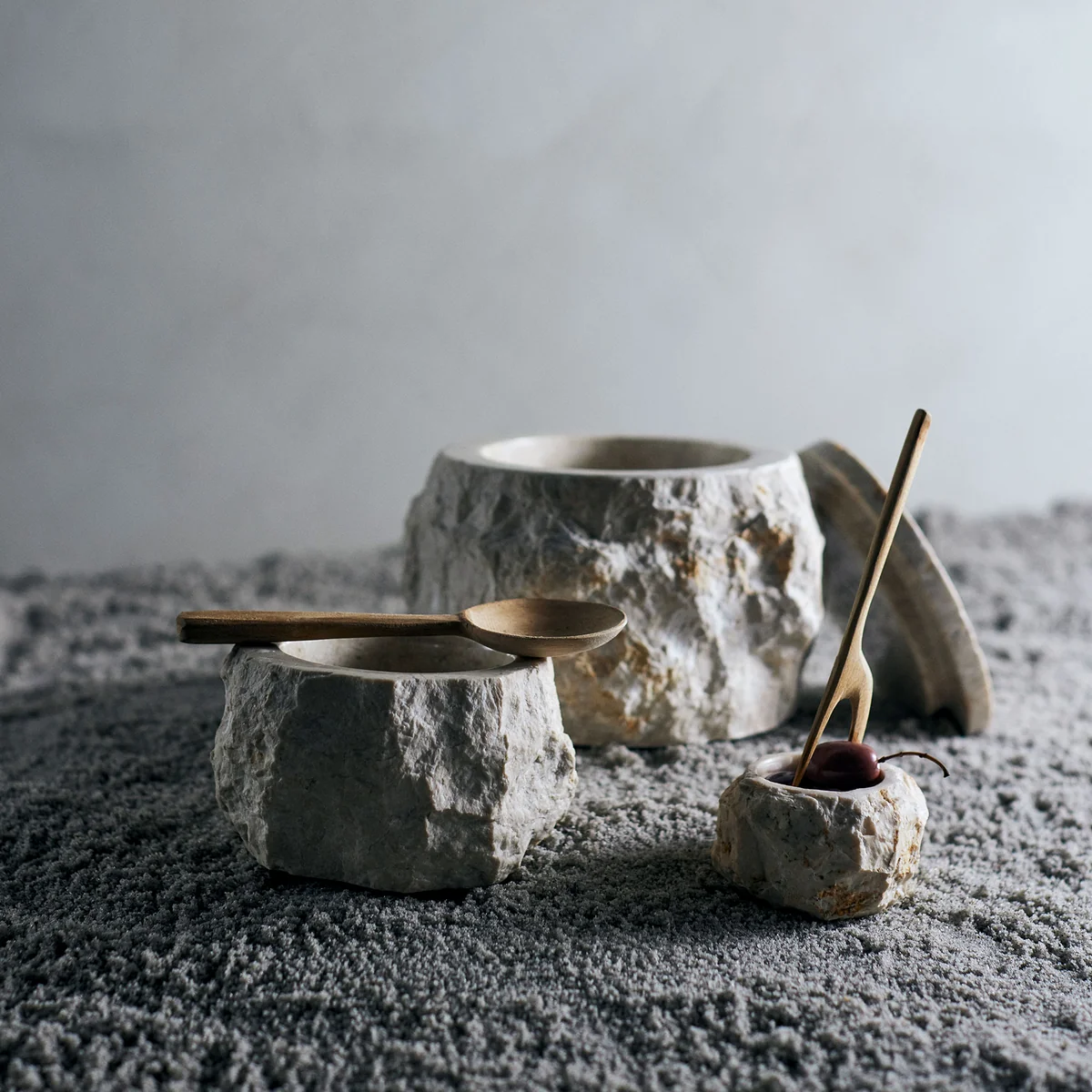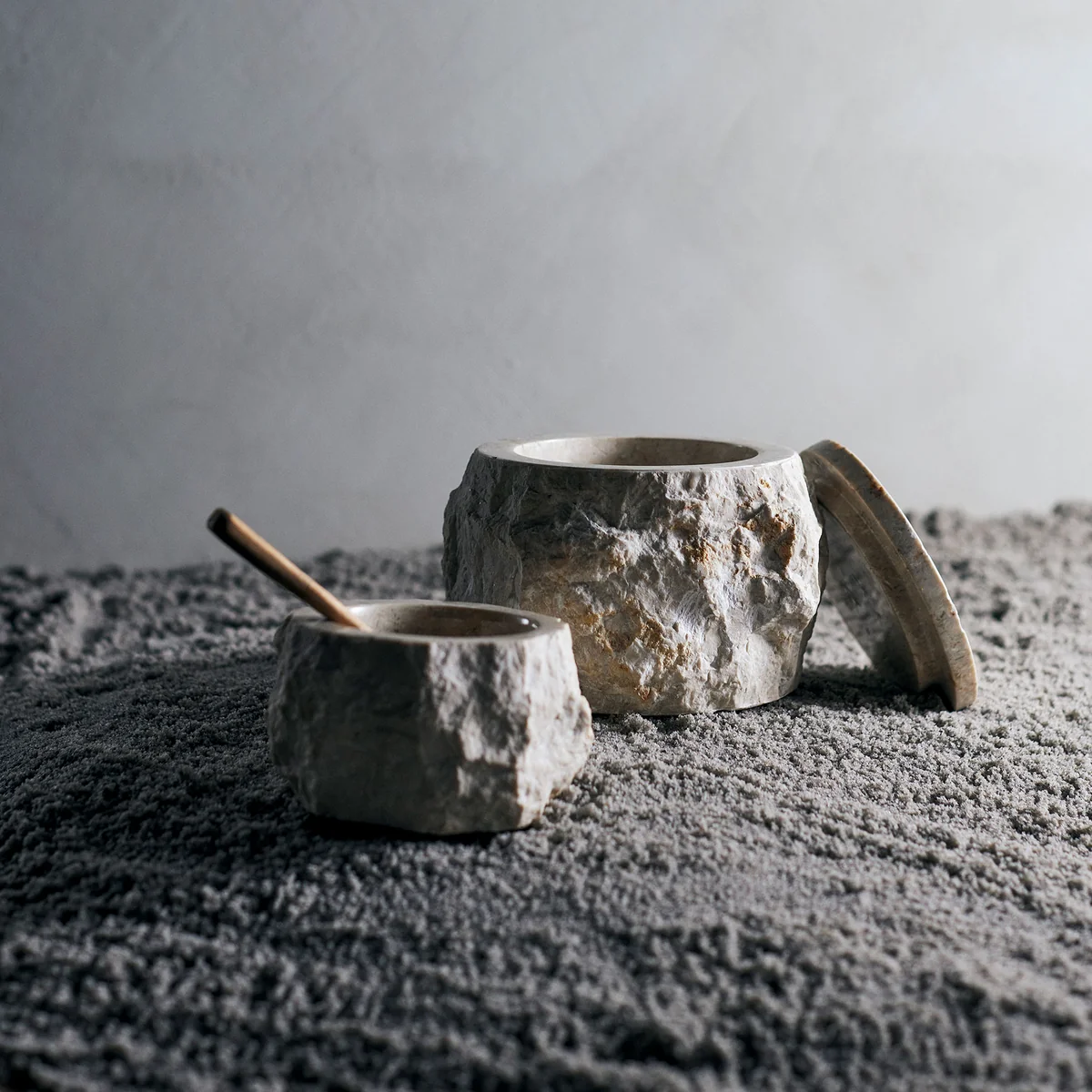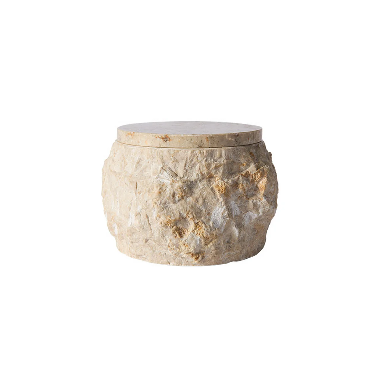 De Batu box is gemaakt van fijn marmer uit de berghellingen van Indonesië. Het handgevormde, sculpturale uiterlijk geeft het een natuurlijke en rustieke charme - in overeenstemming met de naam "Batu", wat "steen" betekent in het Indonesisch. Elke pot is uniek: de natuurlijke kleurnuances en adering van het marmer zorgen voor individuele variaties in vorm en uiterlijk. Het gladde deksel benadrukt de fijne details van de steen en maakt het doosje tot een decoratief en functioneel object - of het nu in de badkamer staat om sieraden in op te bergen of op de eettafel voor kleine hapjes.