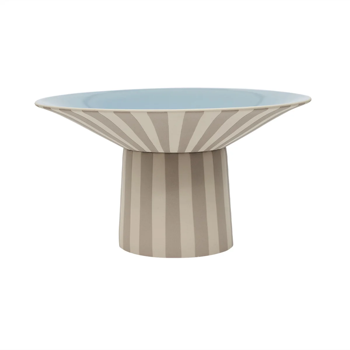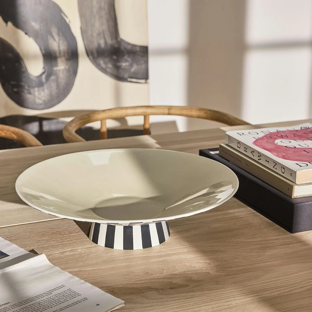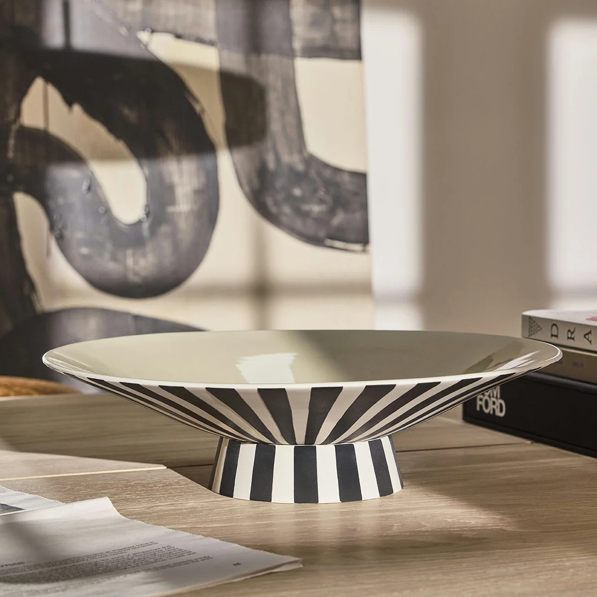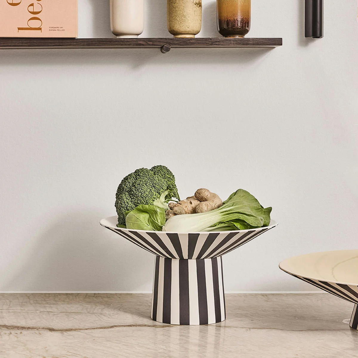 De Toppu Centerpiece decoratieve kom met voet is een sculpturaal hoogtepunt dat met zijn handgeschilderde, levendige strepen een stijlvolle, speelse touch toevoegt aan elke tafel. Als decoratieve kom, serveerschaal of om kleine voorwerpen in op te bergen - dit unieke designstuk combineert functionaliteit met kunst.