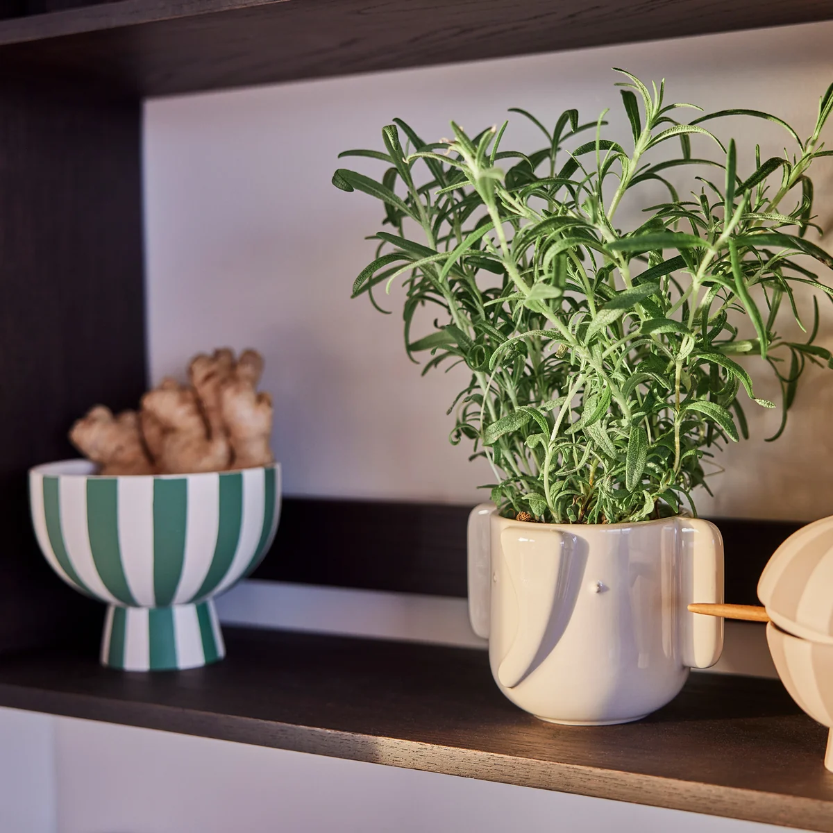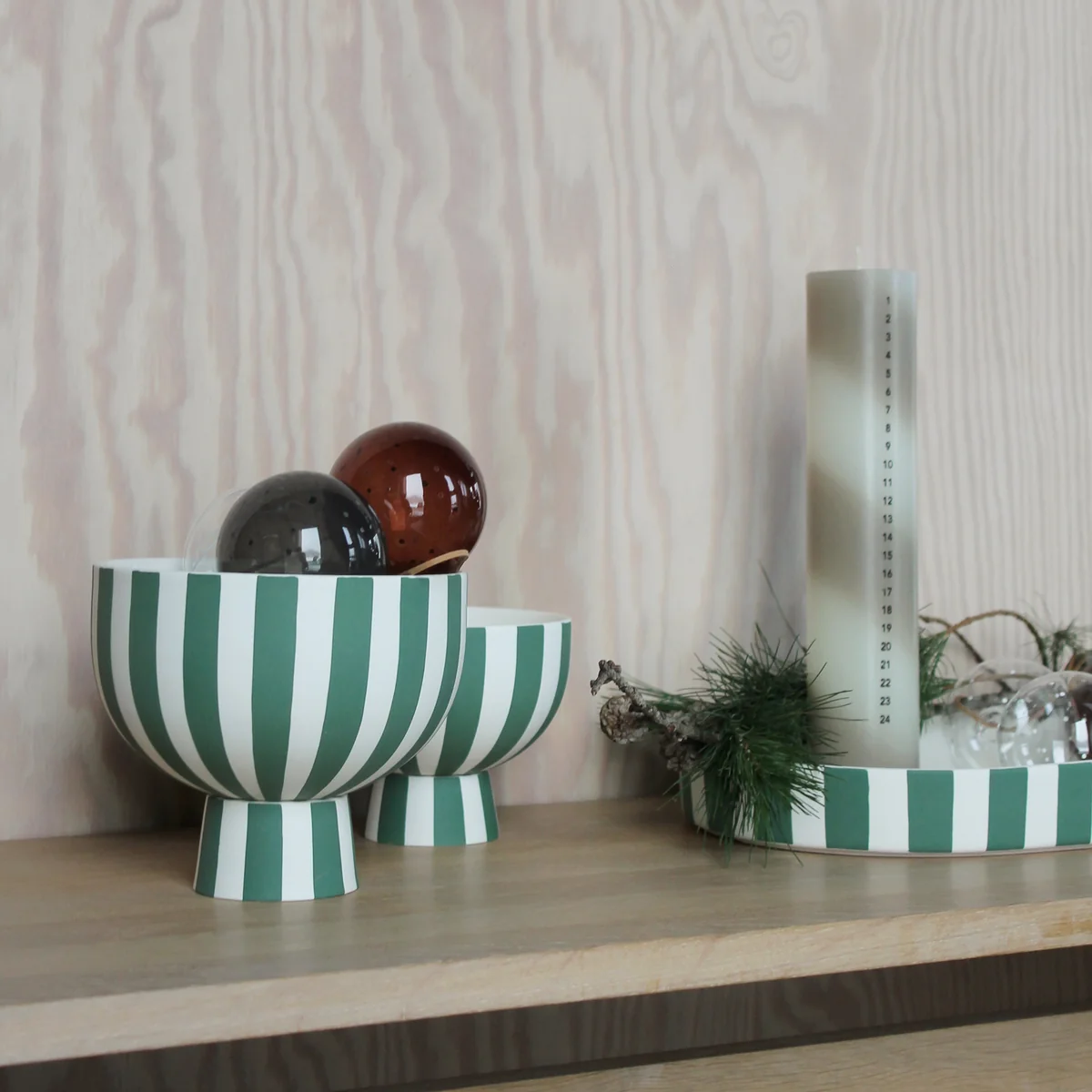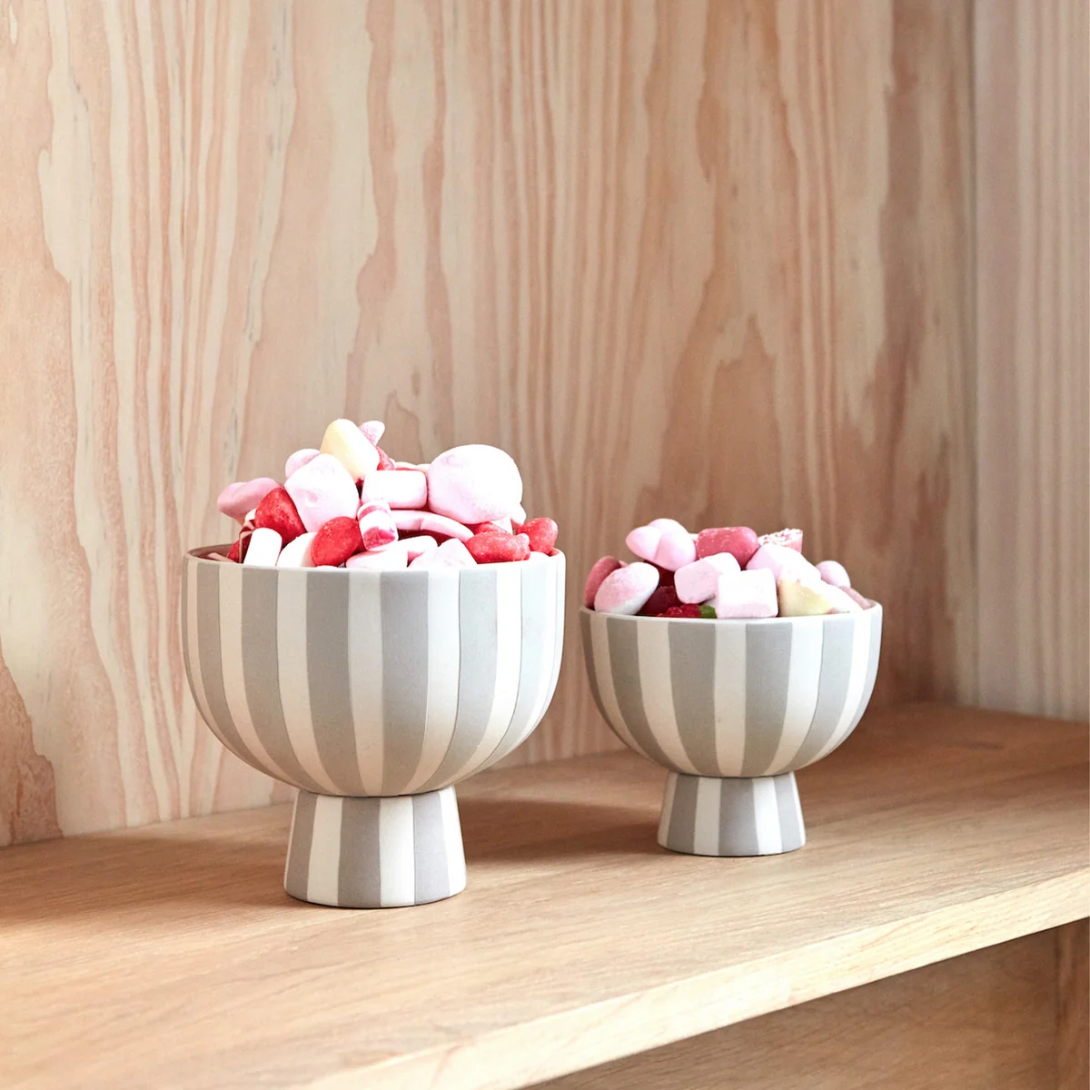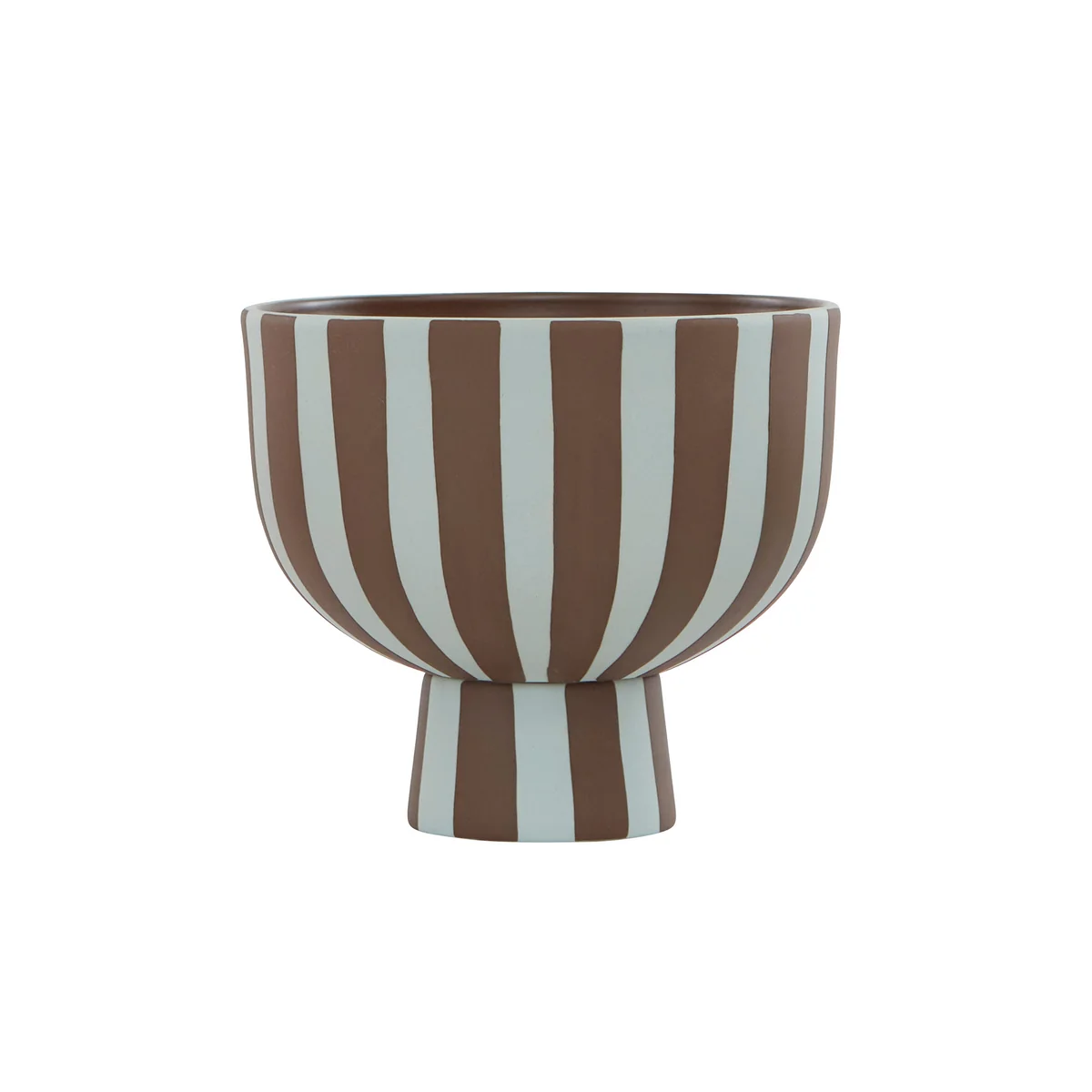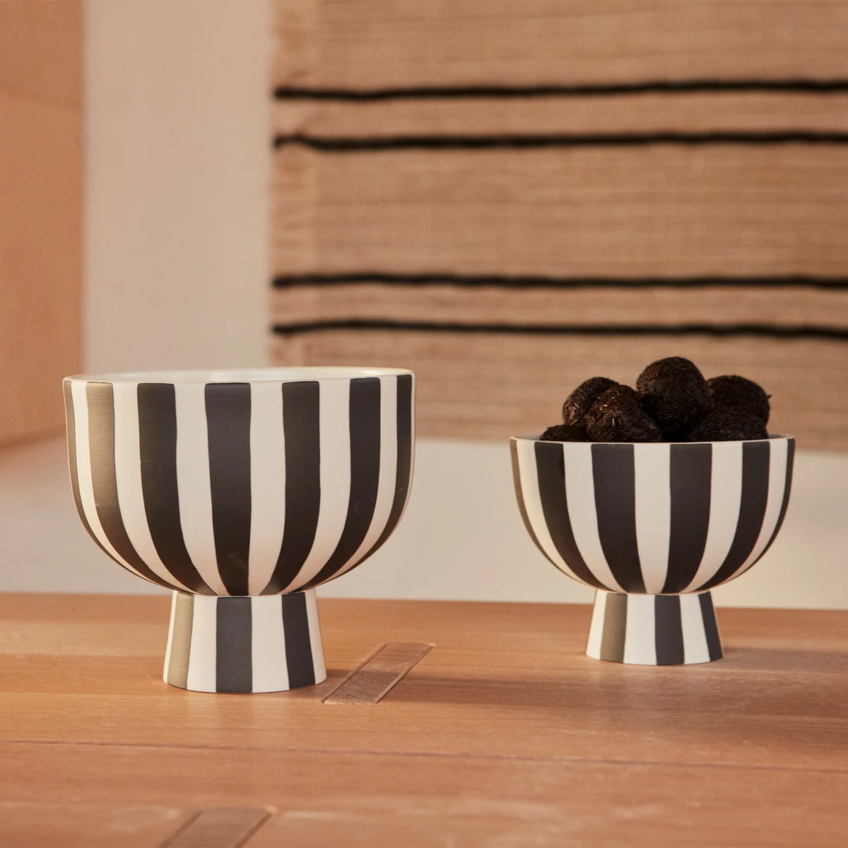De Toppu kommen met voet combineren tijdloze elegantie met een opvallende gestreepte look. Ze zijn gemaakt van 100% handgemaakt keramiek en maken een stijlvol statement in elk interieur. Ze zijn ideaal als decoratieve schaal, bloempot of voor het serveren van fruit en snacks, omdat ze voedselveilig zijn.