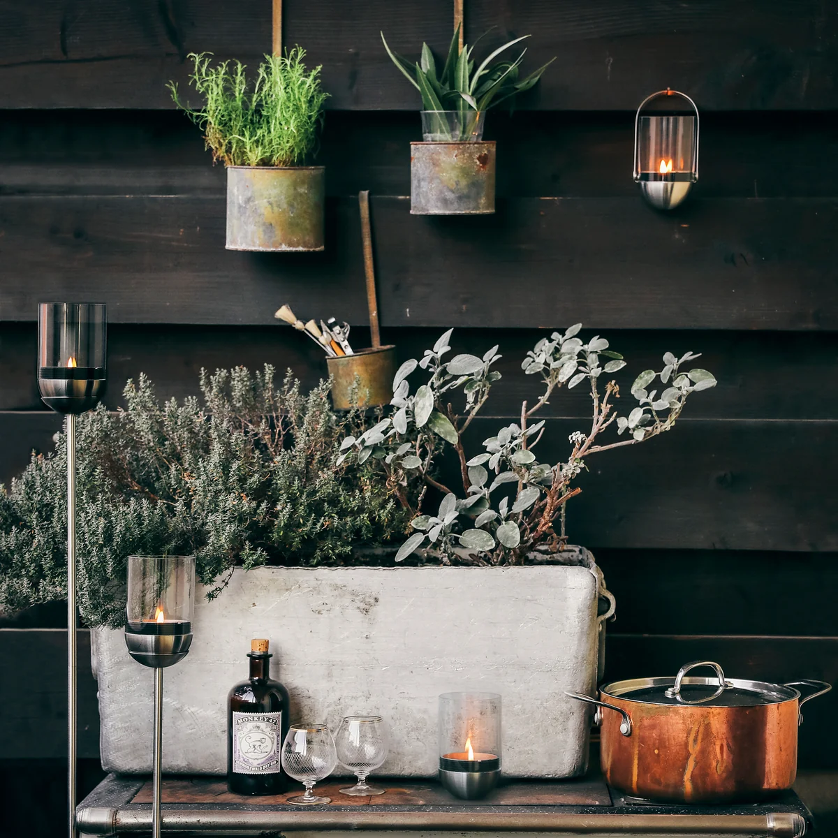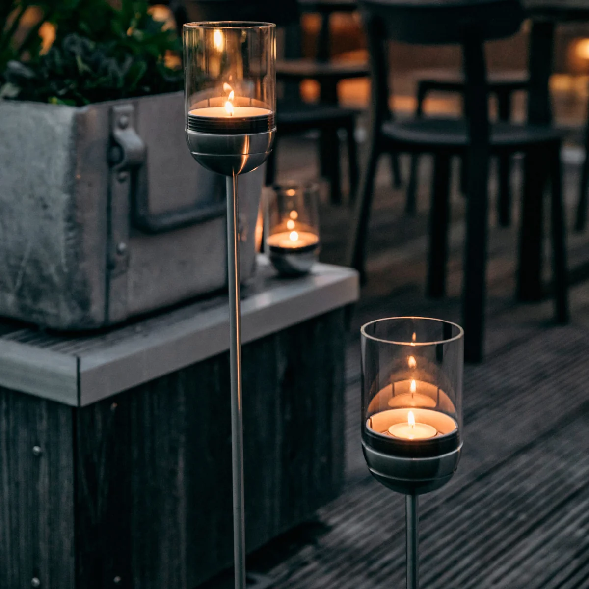 De glazen lantaarn is gemaakt van glas omgeven door een afgeronde zink gegoten voet. Dankzij het ingetogen design past de elegante kandelaar perfect in elke interieurstijl en buitenruimte. Het staat op de tuintafel en zorgt voor een gezellige sfeer.