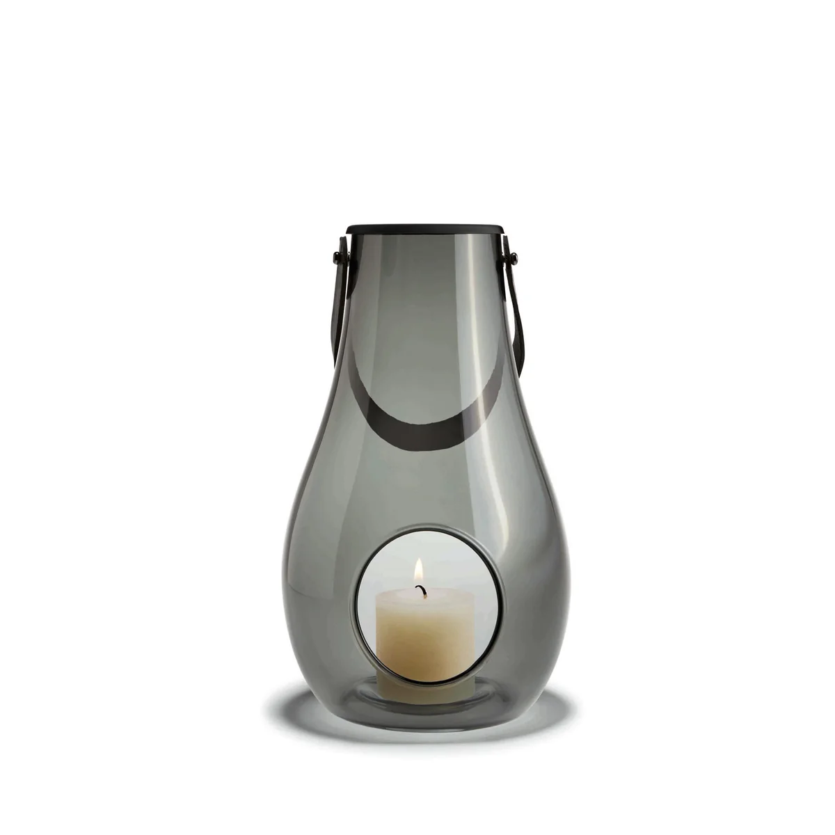 De lantaarns met leren handgrepen van Holmegaard zijn uitgevoerd in transparant of mat wit glas. Naar wens kunnen er waxinelichtjes of blokkaarsen in het druppelvormige midden worden geplaatst.