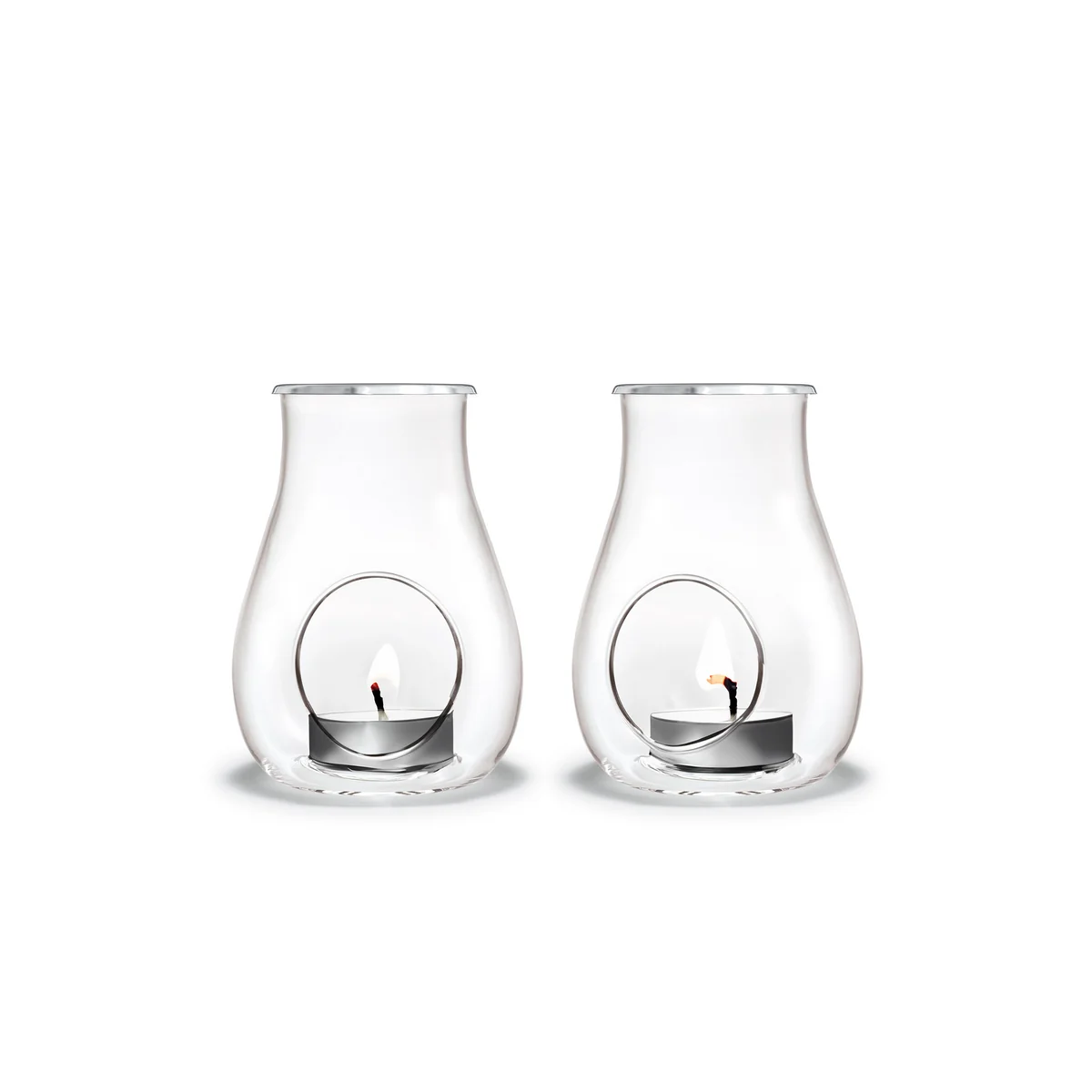 De lantaarns met leren handgrepen van Holmegaard zijn uitgevoerd in transparant of mat wit glas. Naar wens kunnen er waxinelichtjes of blokkaarsen in het druppelvormige midden worden geplaatst.