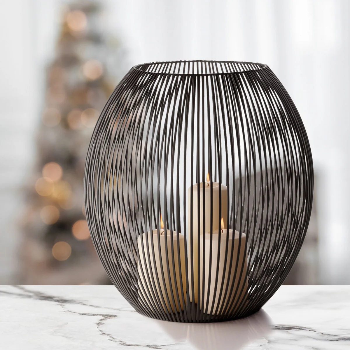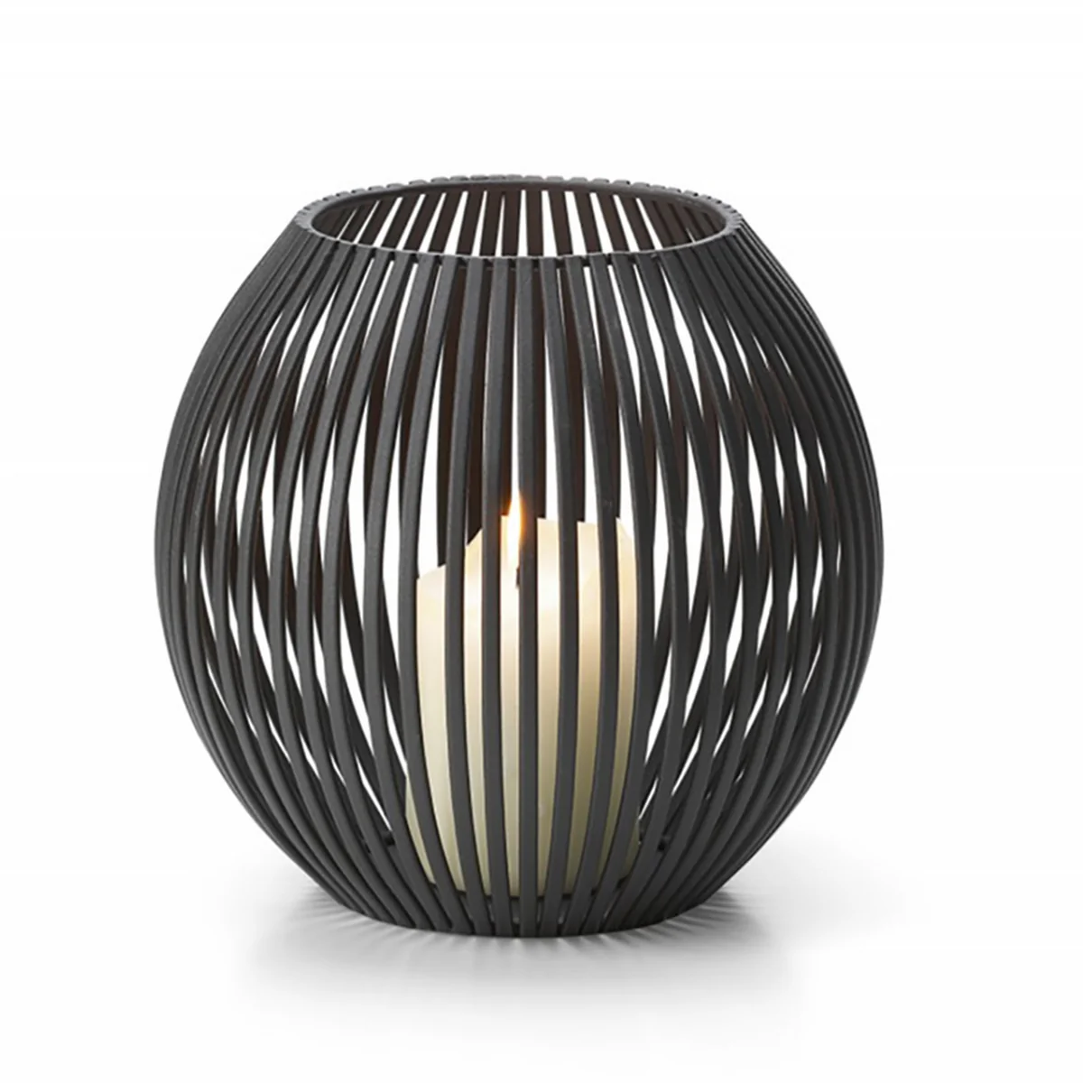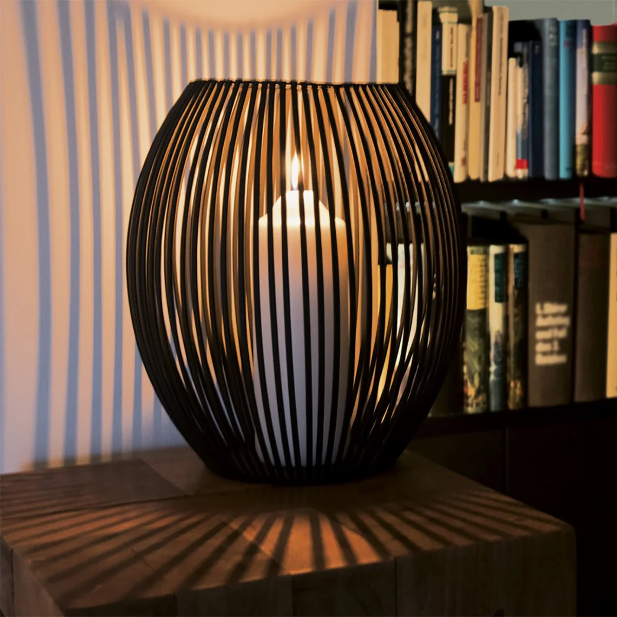 De lantaarn bestaat uit smalle latjes waar het licht van de kaarsvlam doorheen schijnt, waardoor een spel van licht en schaduw ontstaat. De gebogen vorm zorgt voor een harmonieus totaalbeeld dat perfect past in elke ambiance.