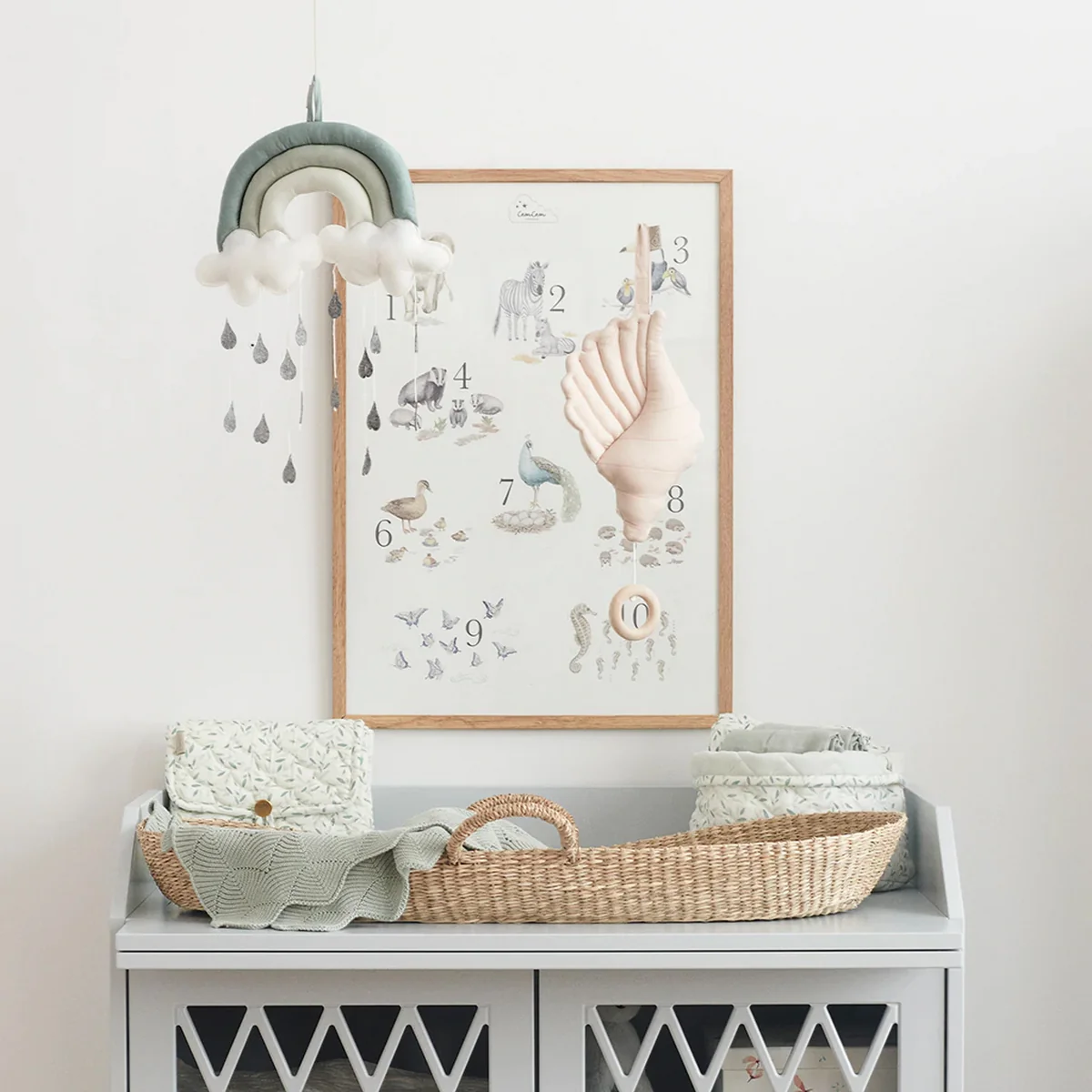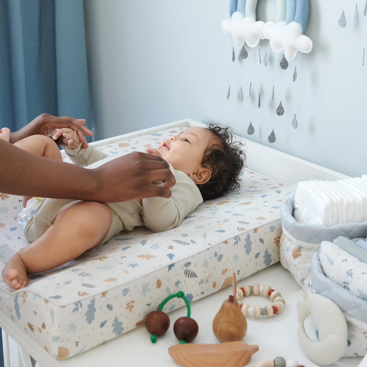 De regenboogmobiel van de Deense fabrikant Cam Cam Copenhagen inspireert met zijn verrukkelijke design. Het kan boven het bedje of de luiertafel worden gehangen, afhankelijk van persoonlijke voorkeur. De dromerige regenboog is gemaakt van een materiaalmix van biologisch katoen en polyester volgens de Oeko-Tex-norm. Het is omgeven door schattige regendruppels van vilt, die zachtjes heen en weer wiegen met lichte bewegingen. Aangezien de regenboogmobiel met de hand wordt gemaakt, kunnen er kleine productvariaties zijn - elke mobiel is uniek.