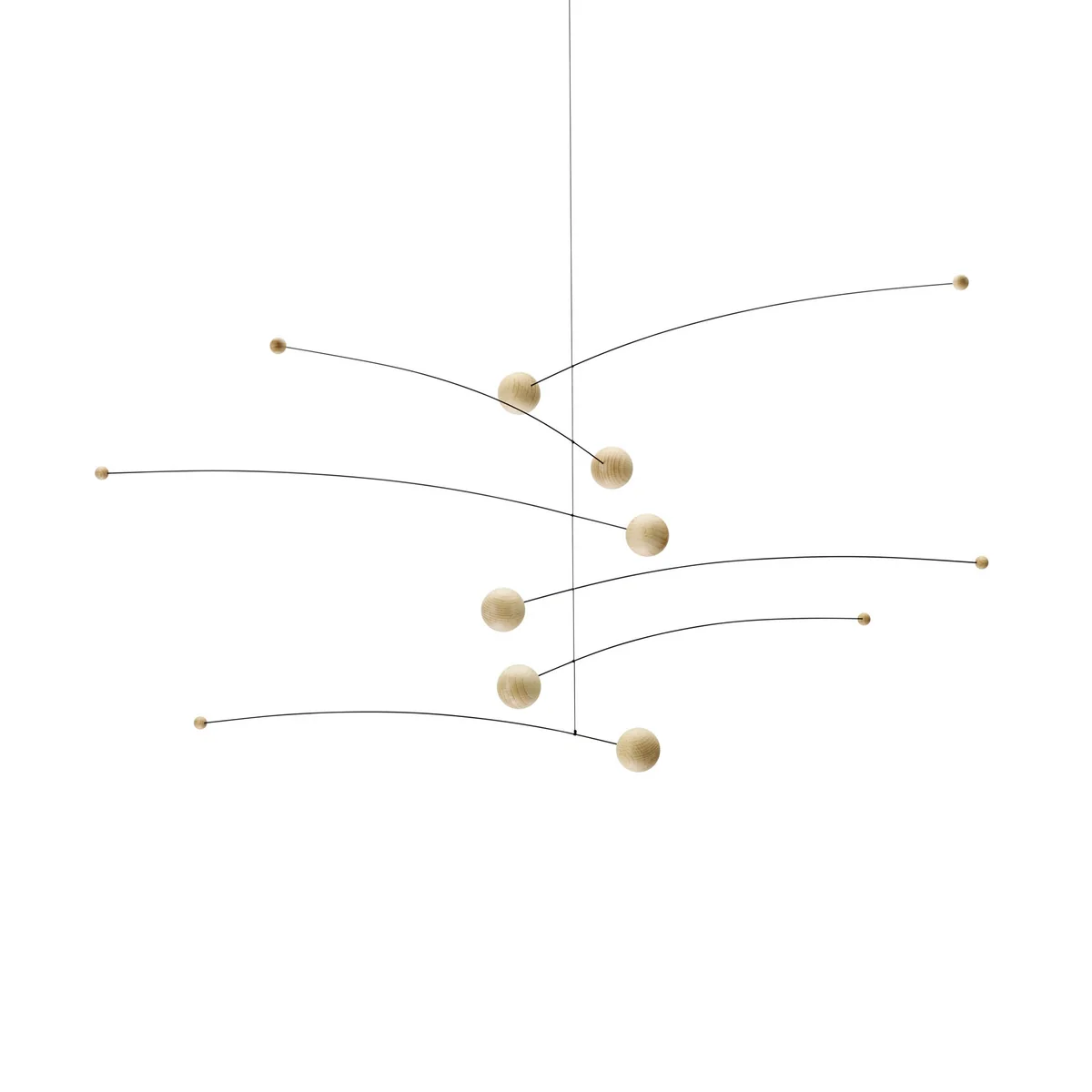 De mobiel laat ruimte voor interpretatie: Zes planeten met hun manen? Of een symbool van de lichte of donkere kanten van het leven?