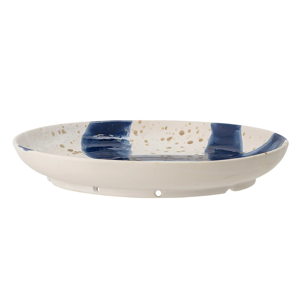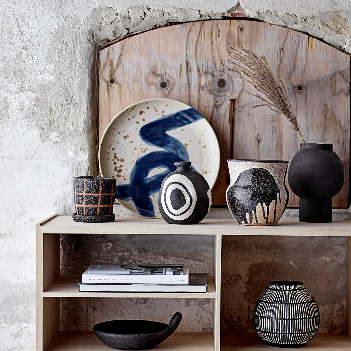 Het bord is gemaakt van voedselveilig steengoed en versierd met handgeschilderde grafische prints die elk stuk uniek maken.