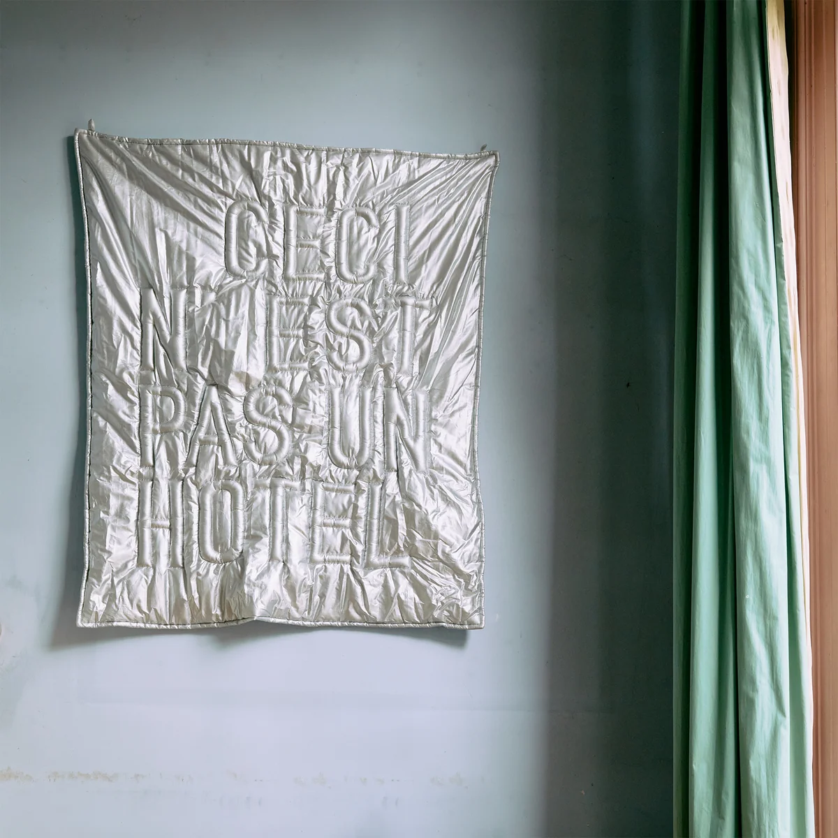 - Met geborduurde quote " Ceci n’est pas un hôtel " van Maaike Koster
