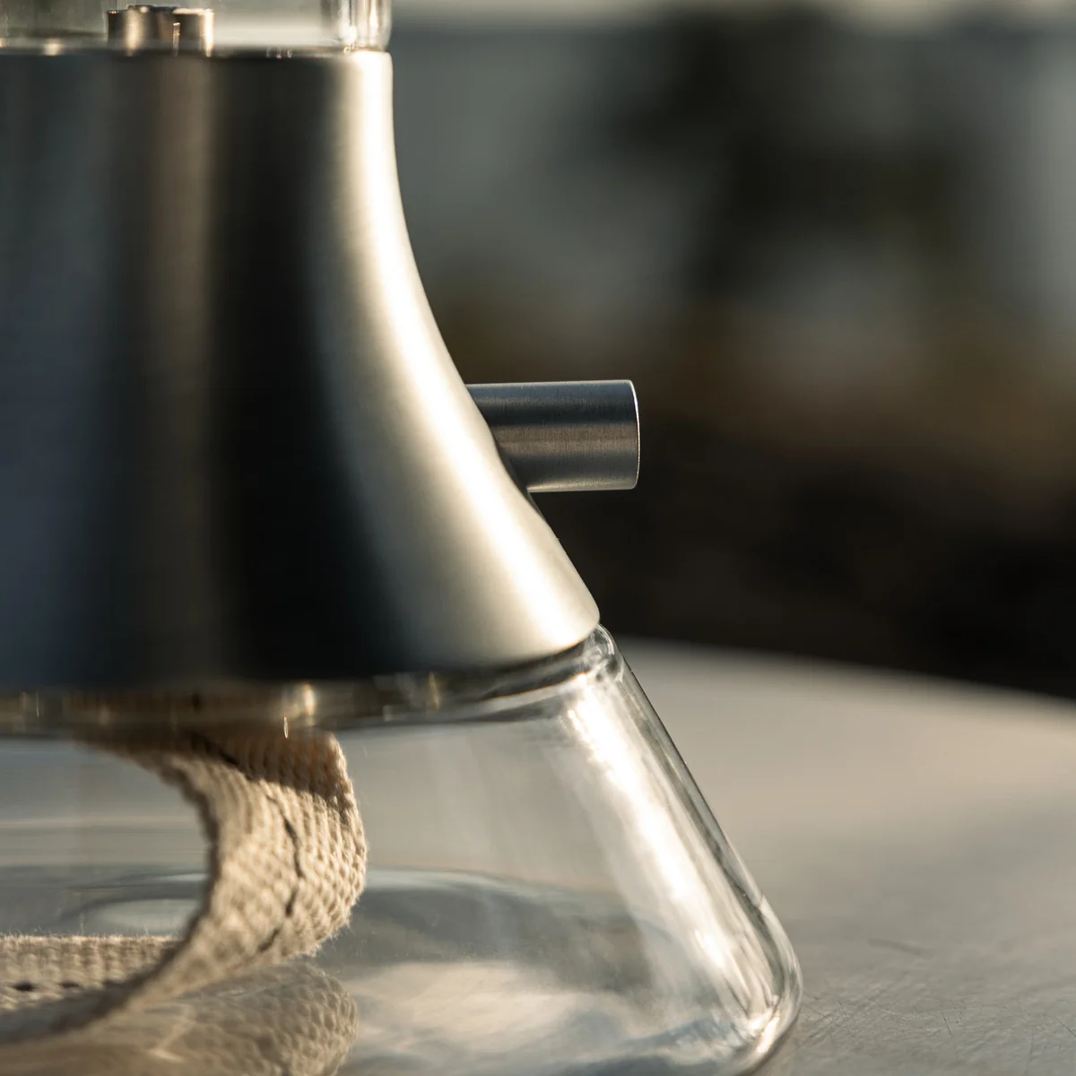 De Fyr olielamp heeft een statige kegelvormige voet, een robuuste taille voor de cilindrische lont en een cilindrische glazen trechter voor de brandende vlam. De sterke maar slanke knop kan worden gebruikt om de vlam aan te passen en de lamp te kantelen voor transport. De volledig doorzichtige glazen voet geeft het resterende oliepeil van de lamp aan en maakt controle over de opwindbeweging mogelijk als de knop wordt gedraaid.