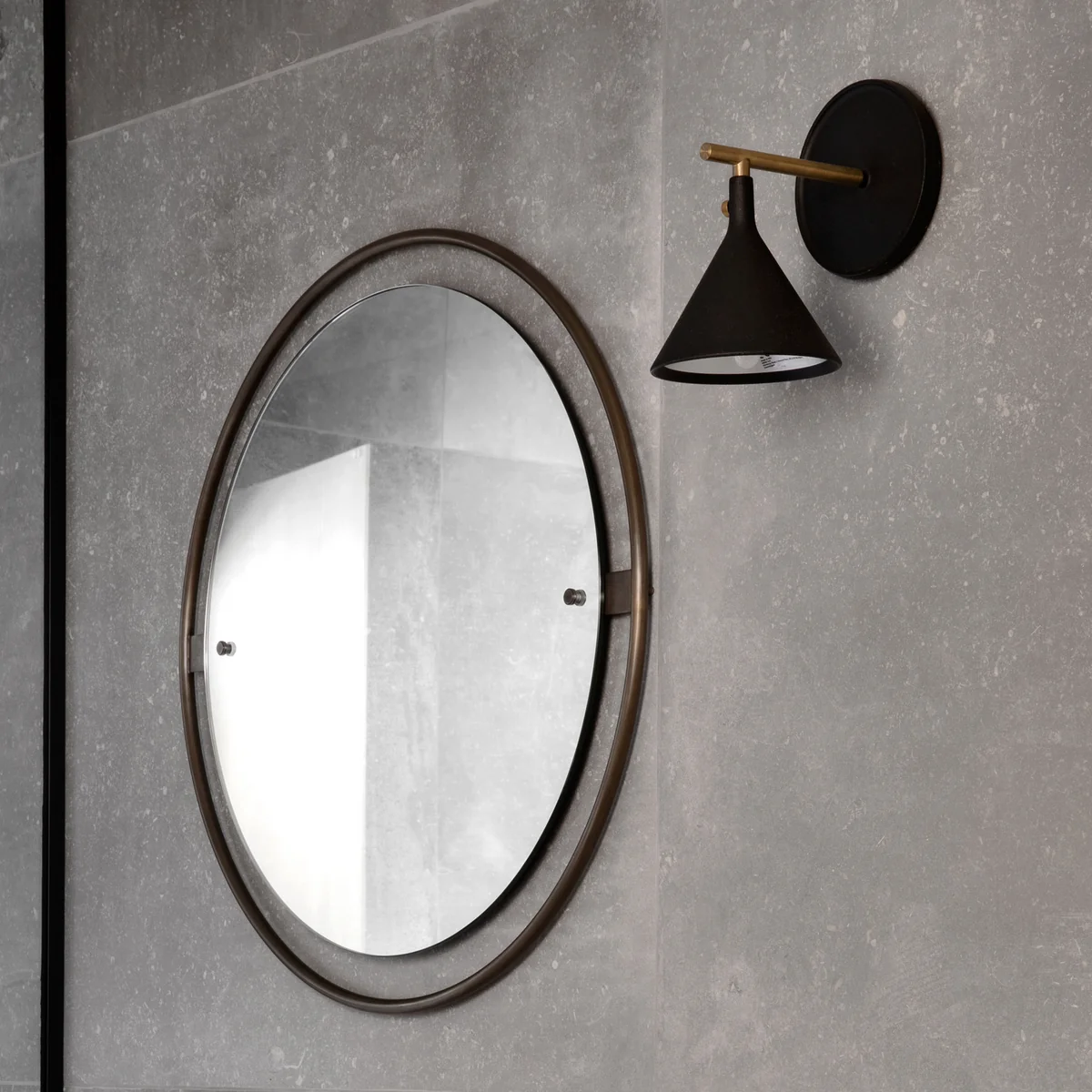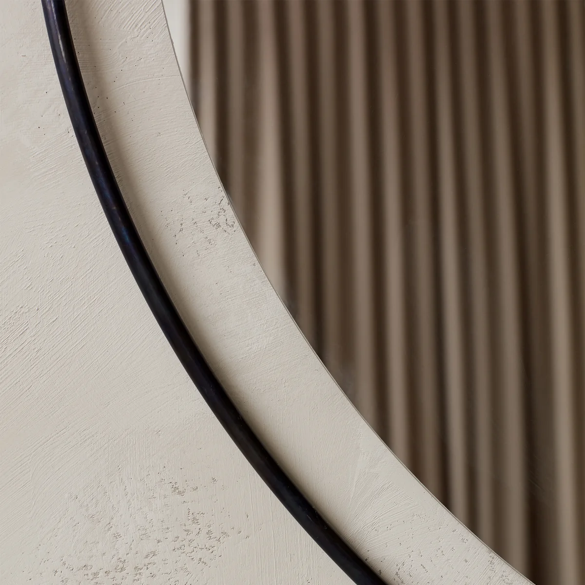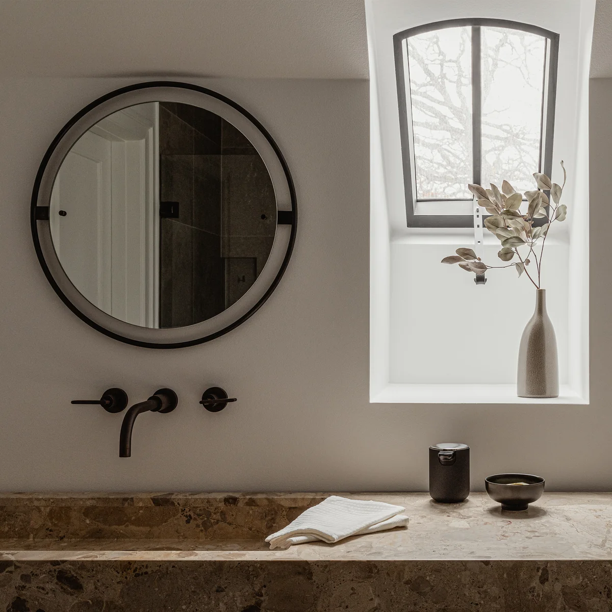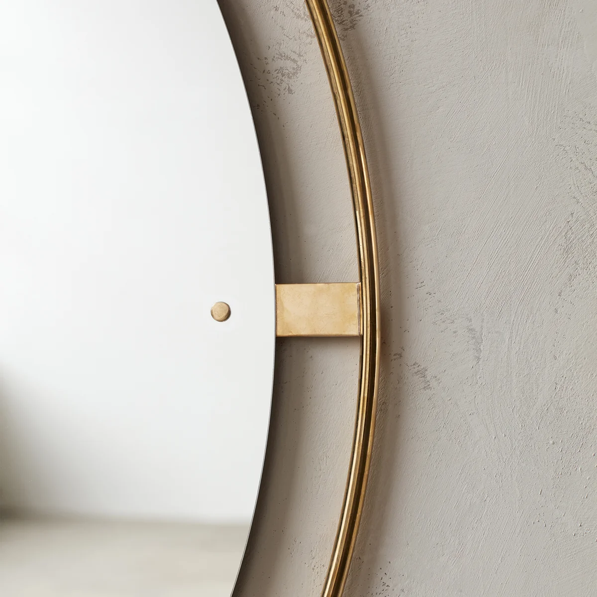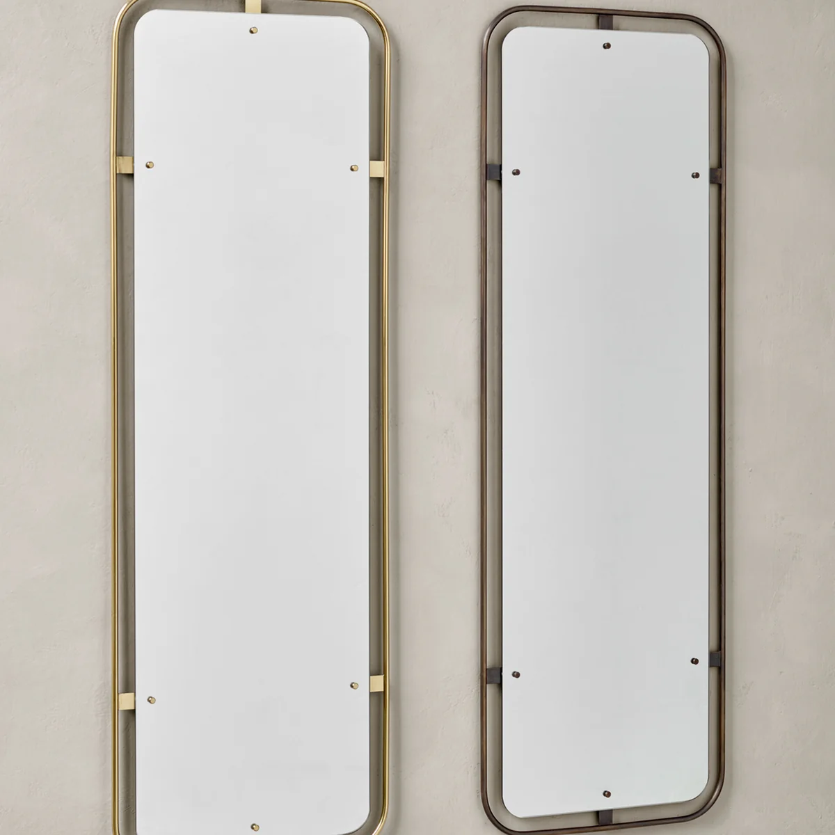 De designstudio Krøyer-Sætter-Lassen uit Kopenhagen keek naar de manier waarop een foto of schilderij tot zijn recht komt door een lijst en onderzocht hetzelfde voor een spiegel, zonder de schoonheid en de reflectie van het glas op de achtergrond te plaatsen. Het resultaat is de ronde of rechthoekige Nimbus spiegel van Audo met een frame van gepolijst of gepolijst messing. De lijst is zo geconstrueerd dat er een opening ontstaat tussen het spiegelglas en de lijst, wat zorgt voor een luchtige, lichte en tegelijkertijd elegante uitstraling.