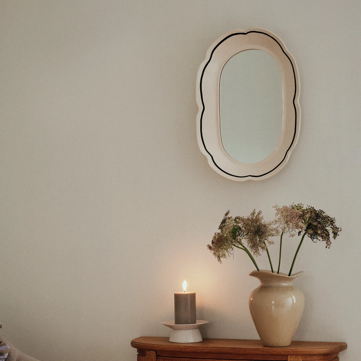 In de hal, slaapkamer of woonkamer - de Hilma de spiegel ziet er niet alleen functioneel uit, maar ook als een stijlvol kunstobject aan de muur. Het hoogwaardige keramiek zorgt voor stabiliteit en een elegante uitstraling. Elk stuk is net iets anders en daarom echt uniek.