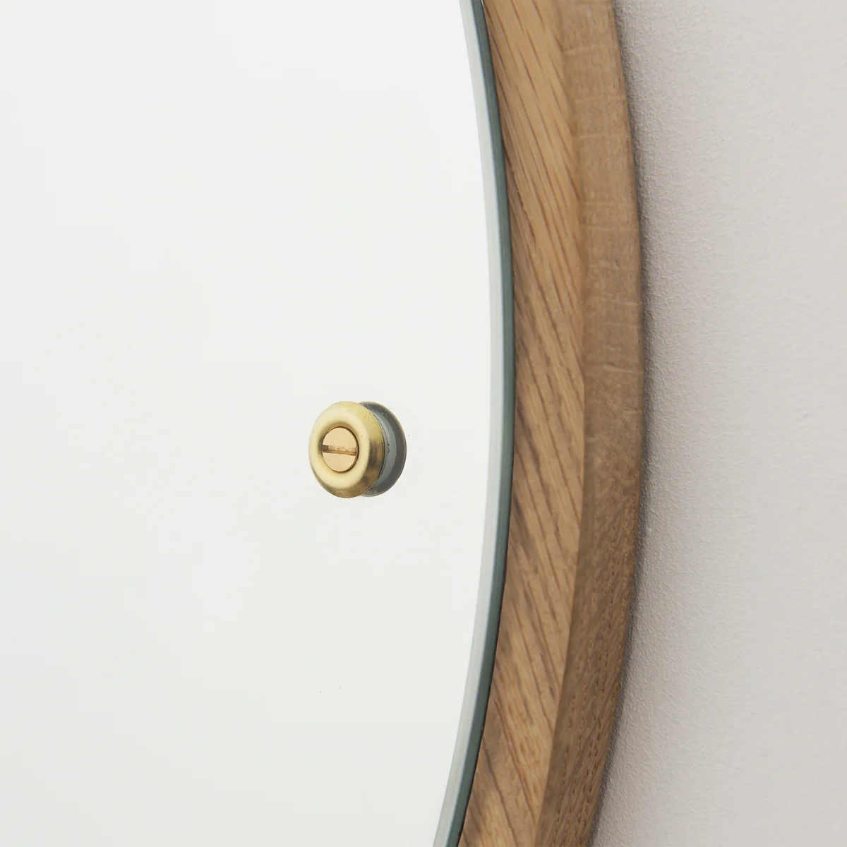 De ronde spiegel is gemonteerd op een massief eikenhouten plaat aan de muur en wordt op zijn plaats gehouden door zichtbare schroeven die een eerbetoon zijn aan de jaren 1950.