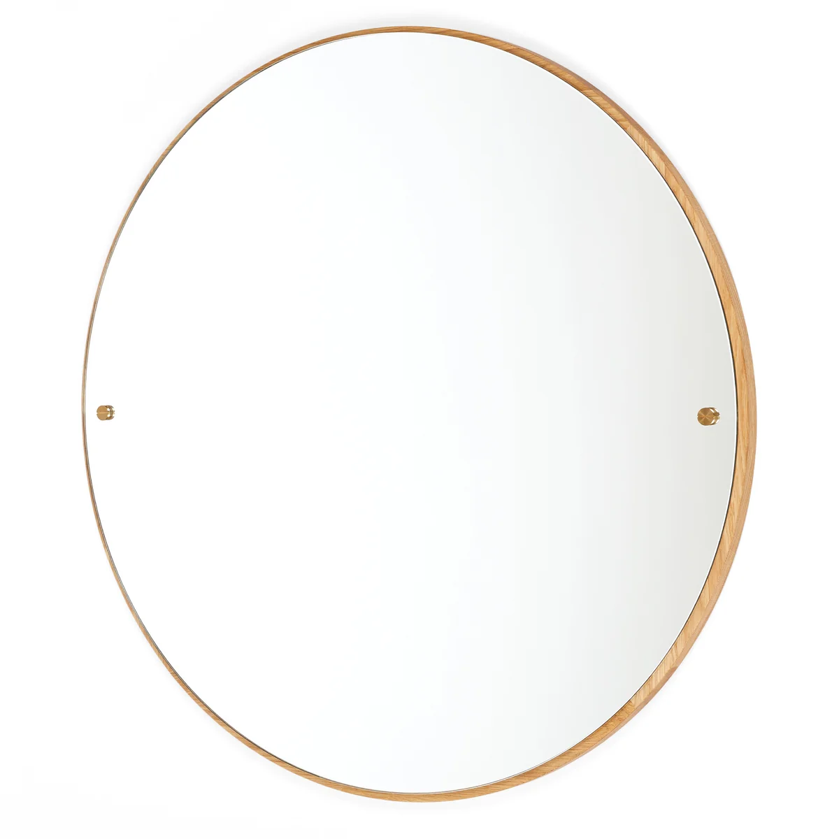 De ronde spiegel is gemonteerd op een massief eikenhouten plaat aan de muur en wordt op zijn plaats gehouden door zichtbare schroeven die een eerbetoon zijn aan de jaren 1950.