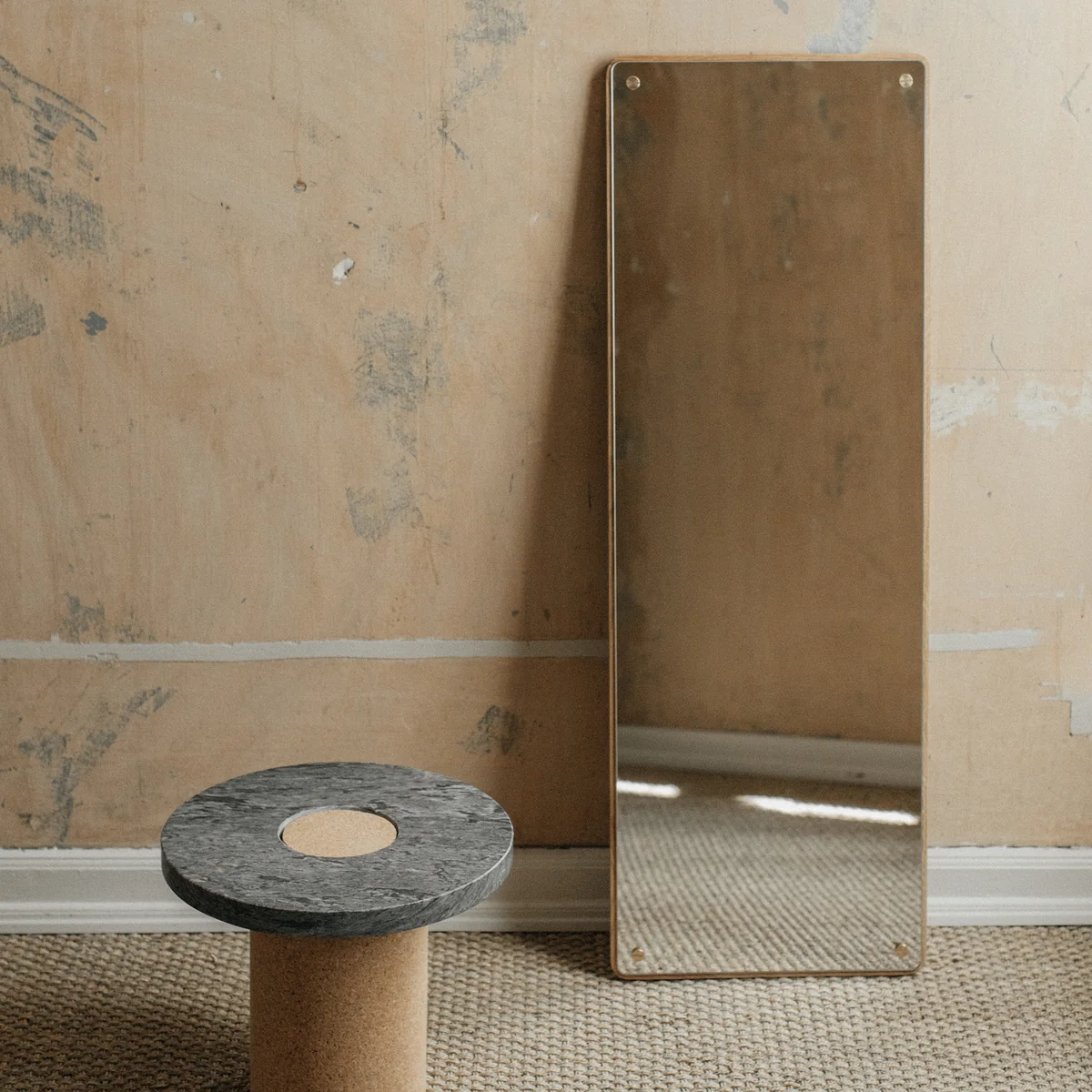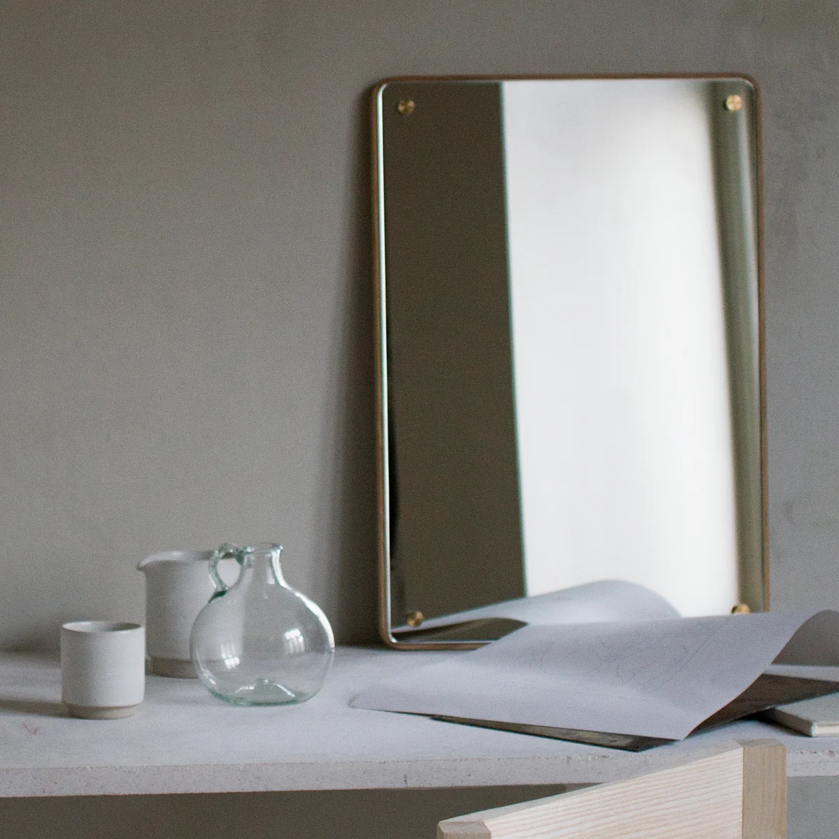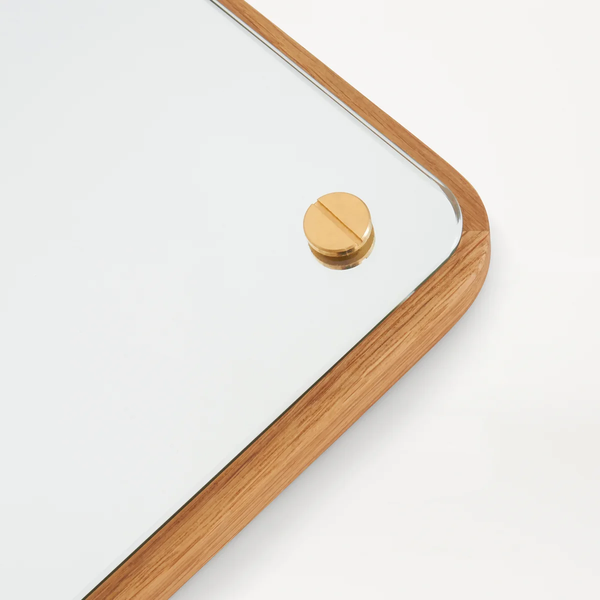 De rechthoekige spiegel is gemonteerd op een plaat van massief eikenhout aan de wand en wordt op zijn plaats gehouden door zichtbare schroeven, een ontwerp dat een eerbetoon is aan de jaren '50 van de vorige eeuw.