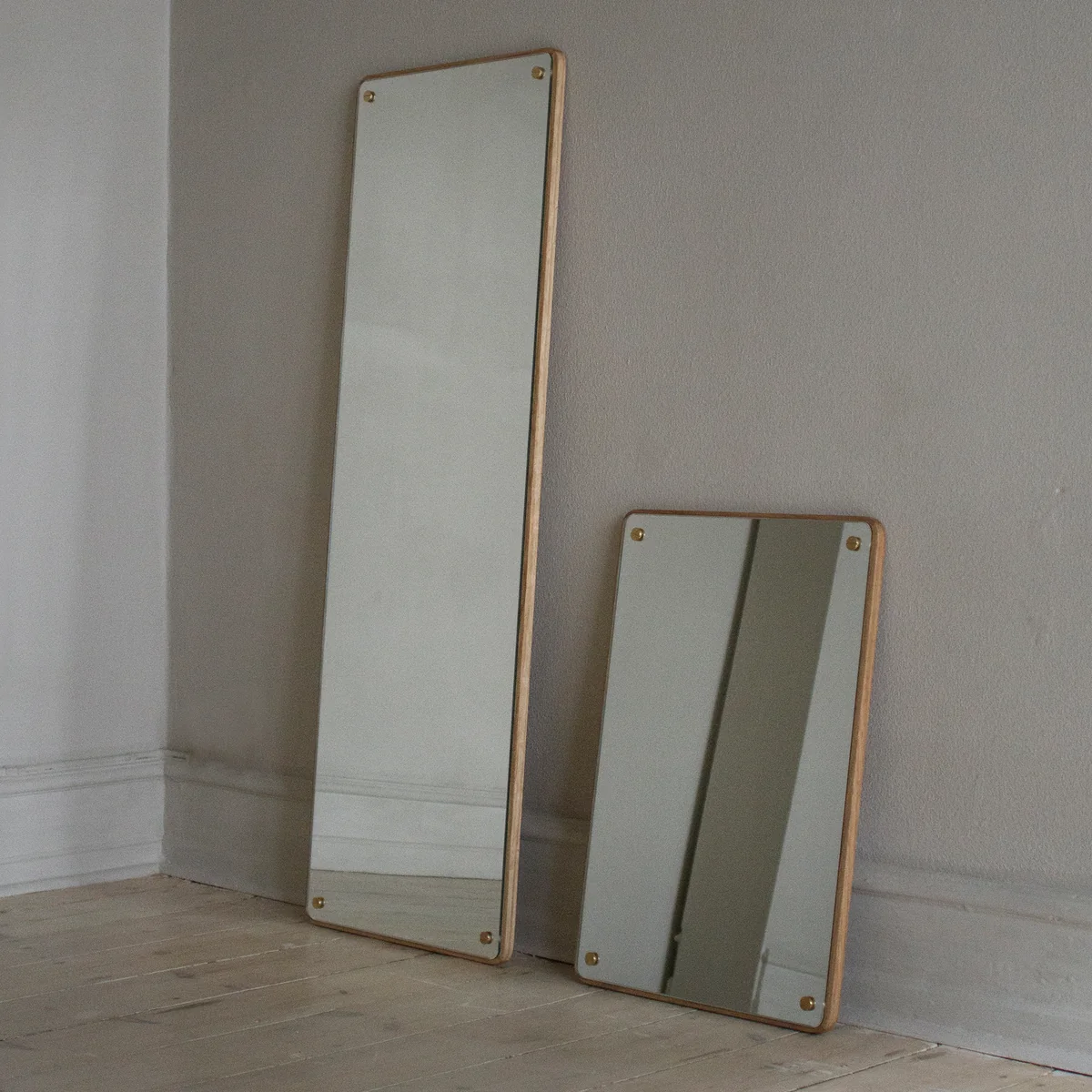 De RM-1 Rectangular De spiegel van Frama is gemaakt van glas, eikenhout en messing. Verkrijgbaar in twee maten.