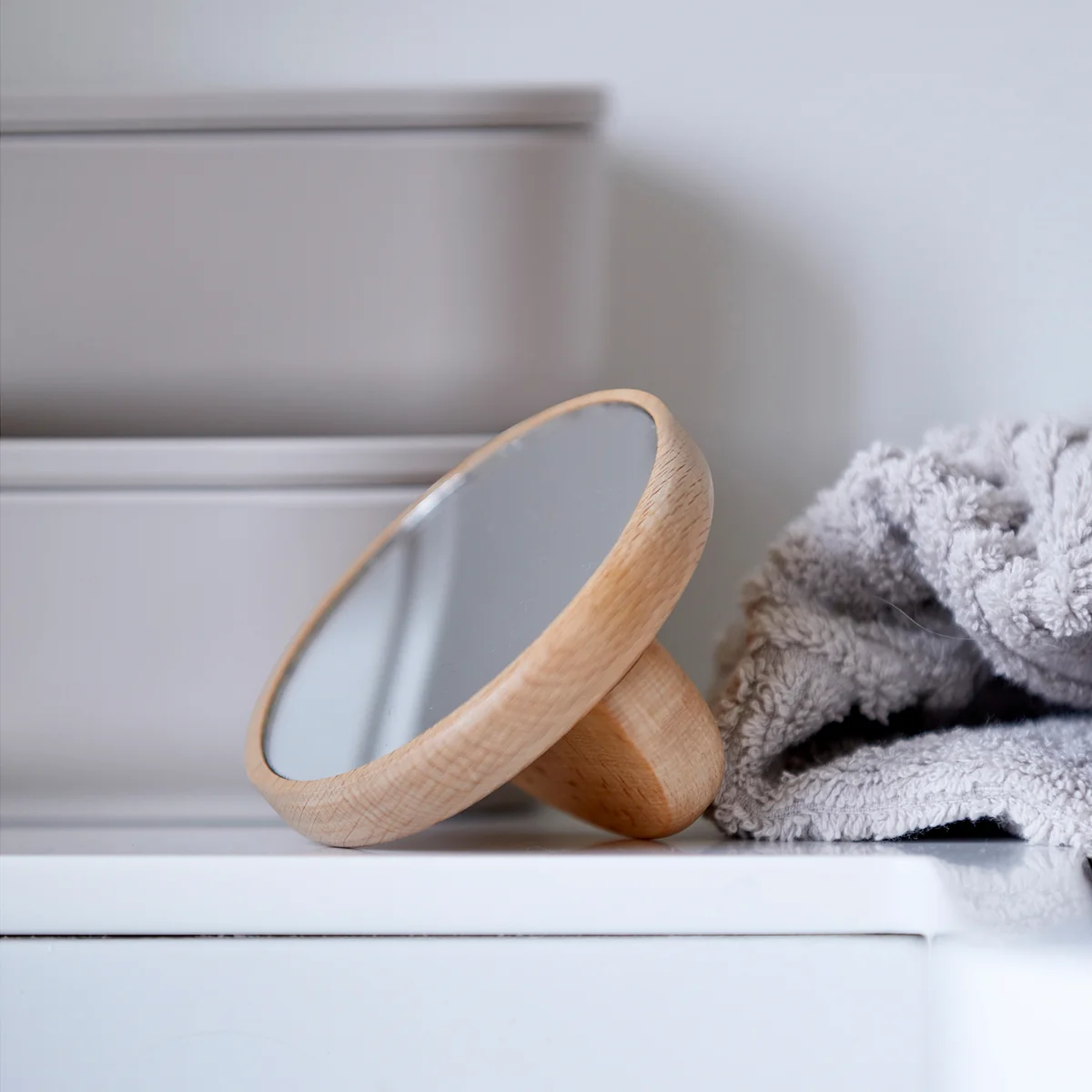 De grotere spiegel is een heerlijke herinterpretatie van de klassieke handspiegel, terwijl de kleine spiegel een halfrond handvat heeft en precies de juiste maat heeft om in uw handtas te dragen. In beide spiegels is het glas in een beukenhouten frame geplaatst, wat een decoratief tintje geeft, zelfs als de spiegel naar beneden gericht is, terwijl het glas beschermd wordt tegen krassen.