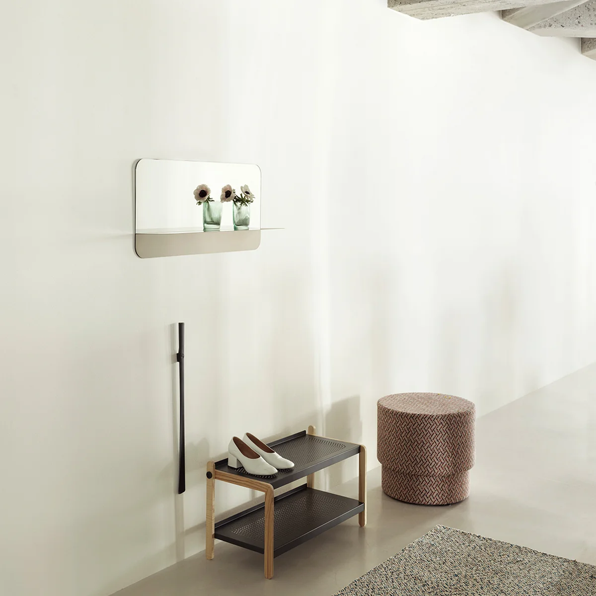 De horizon verhaal Horizon spiegel van Normann Copenhagen is ontworpen door Kaschkasch Cologne en is een wandspiegel met een geïntegreerd stalen planchet waarop sleutels kunnen worden gelegd, evenals accessoires: brillen, sieraden of parfum. Dit maakt de spiegel tot een echt allround talent dat een graag geziene gast is in zowel de badkamer als de gang.