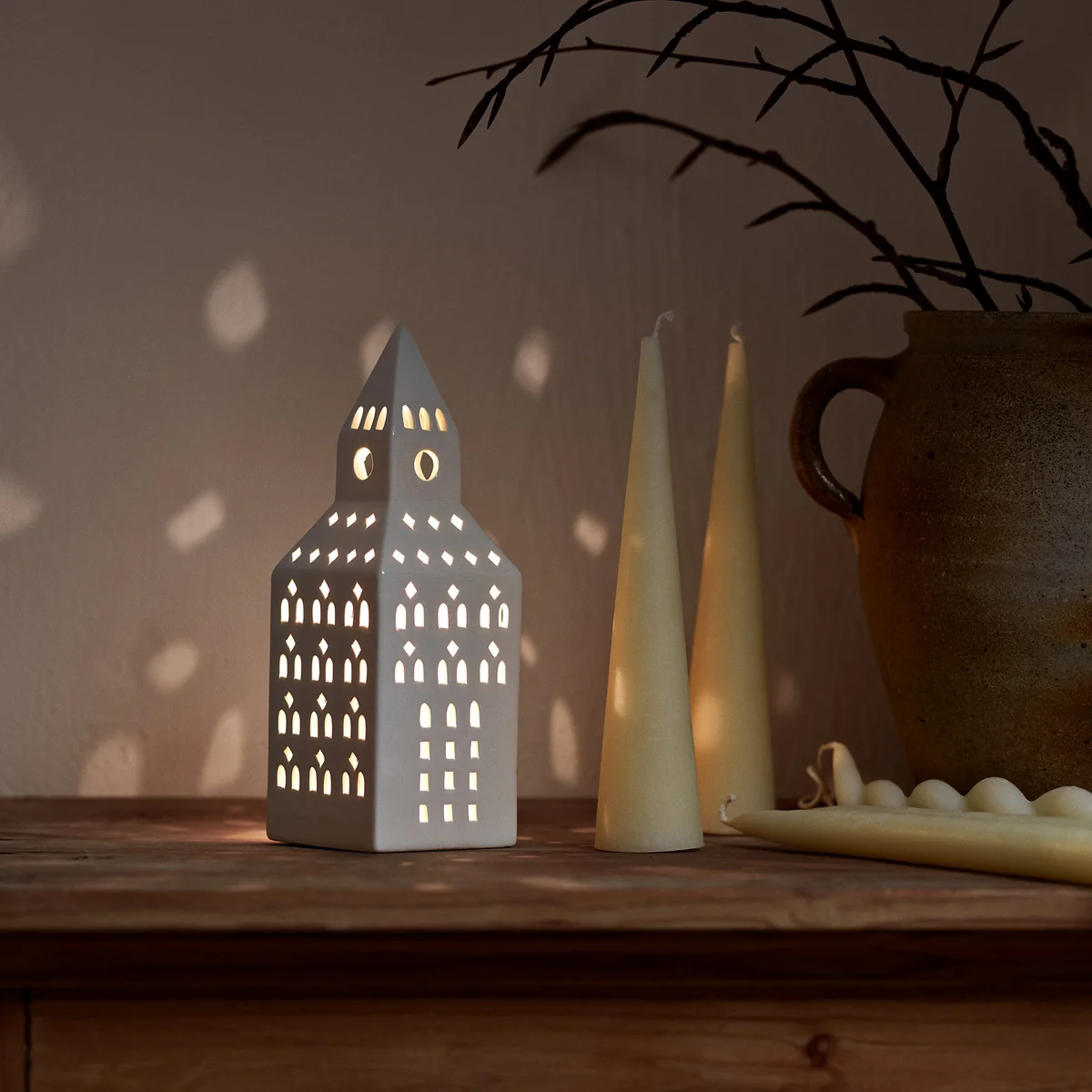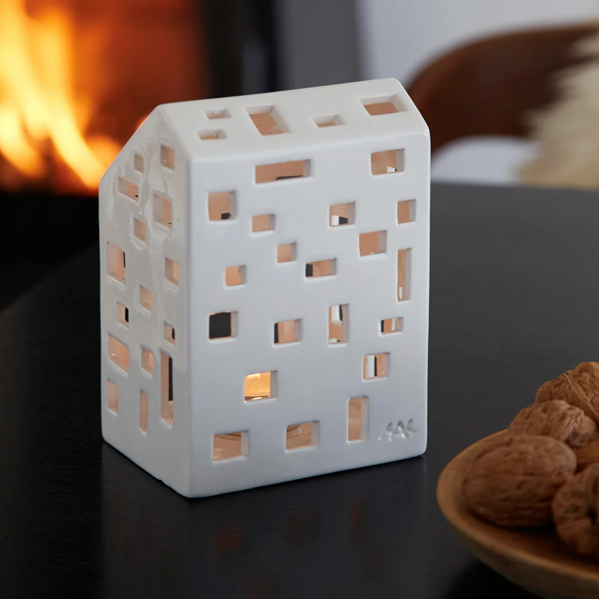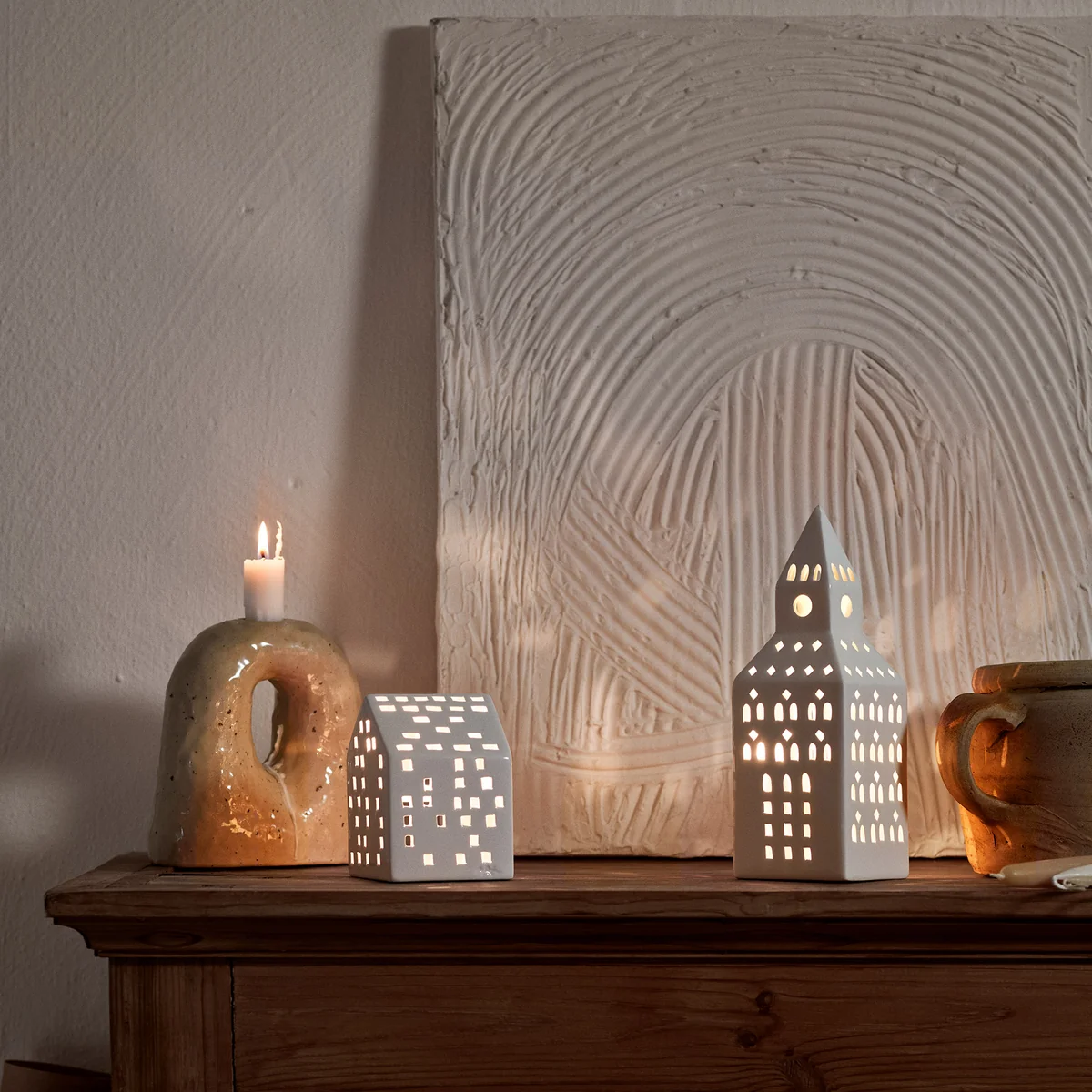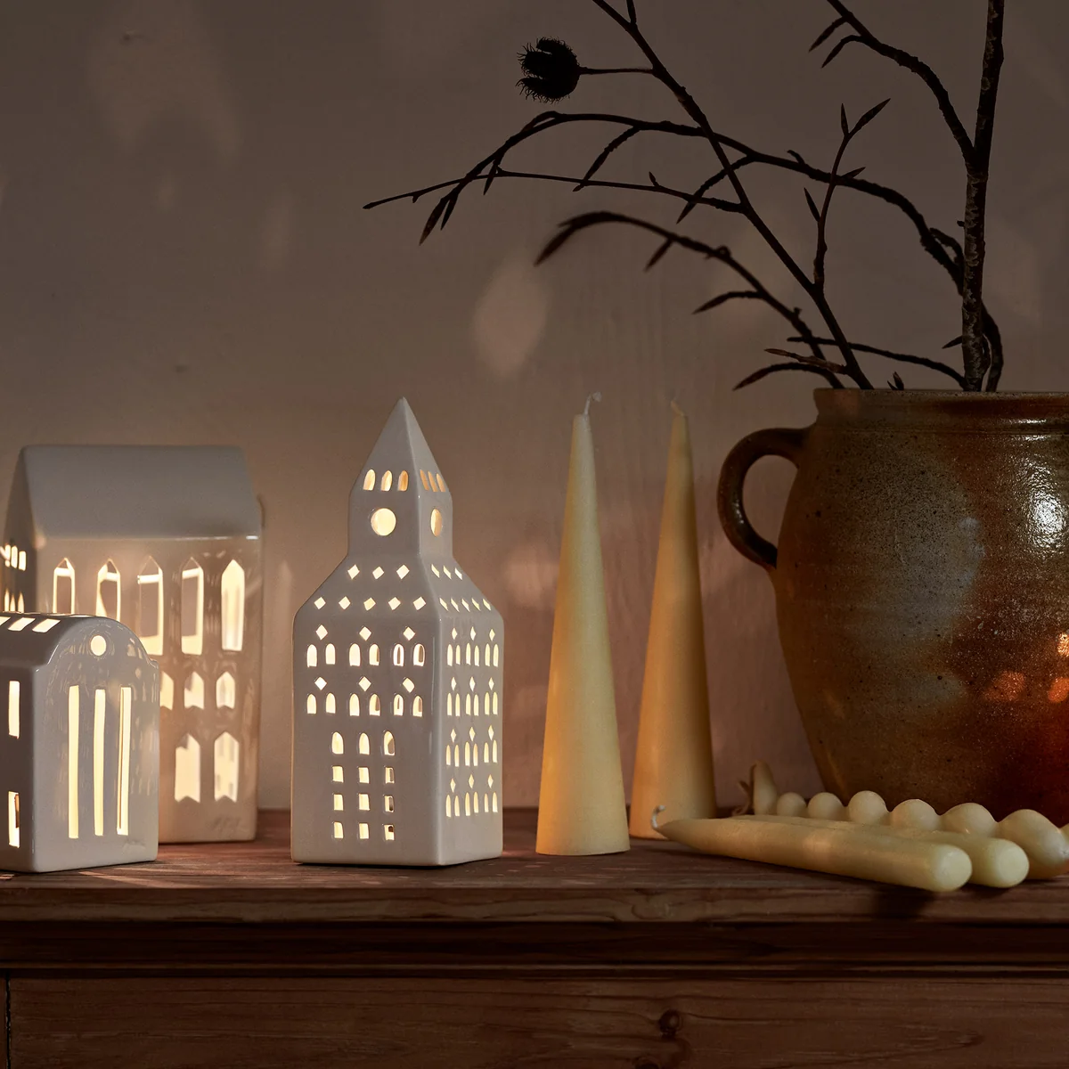 De Urbania theelichthuisjes van Kähler Design zijn theelichthouders van keramiek met handgesneden vensters waardoor een gezellig kaarslicht schijnt. In verschillende architectonische vormen zijn de theelichthouders van Mette Bache en Barbara Bendix Becker een bijzondere blikvanger op elke vensterbank.