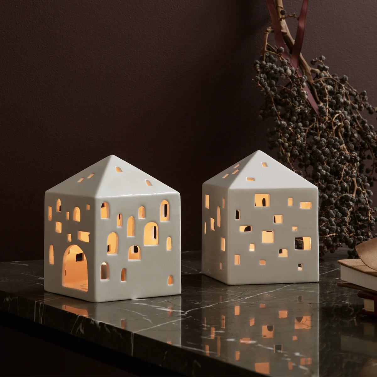 De vorm van de lichthuisjes van Kähler Design is geïnspireerd op stedelijke of sacrale gebouwen zoals traditionele Romeinse basilieken, moderne hoogbouw of functionalistische architectuur.