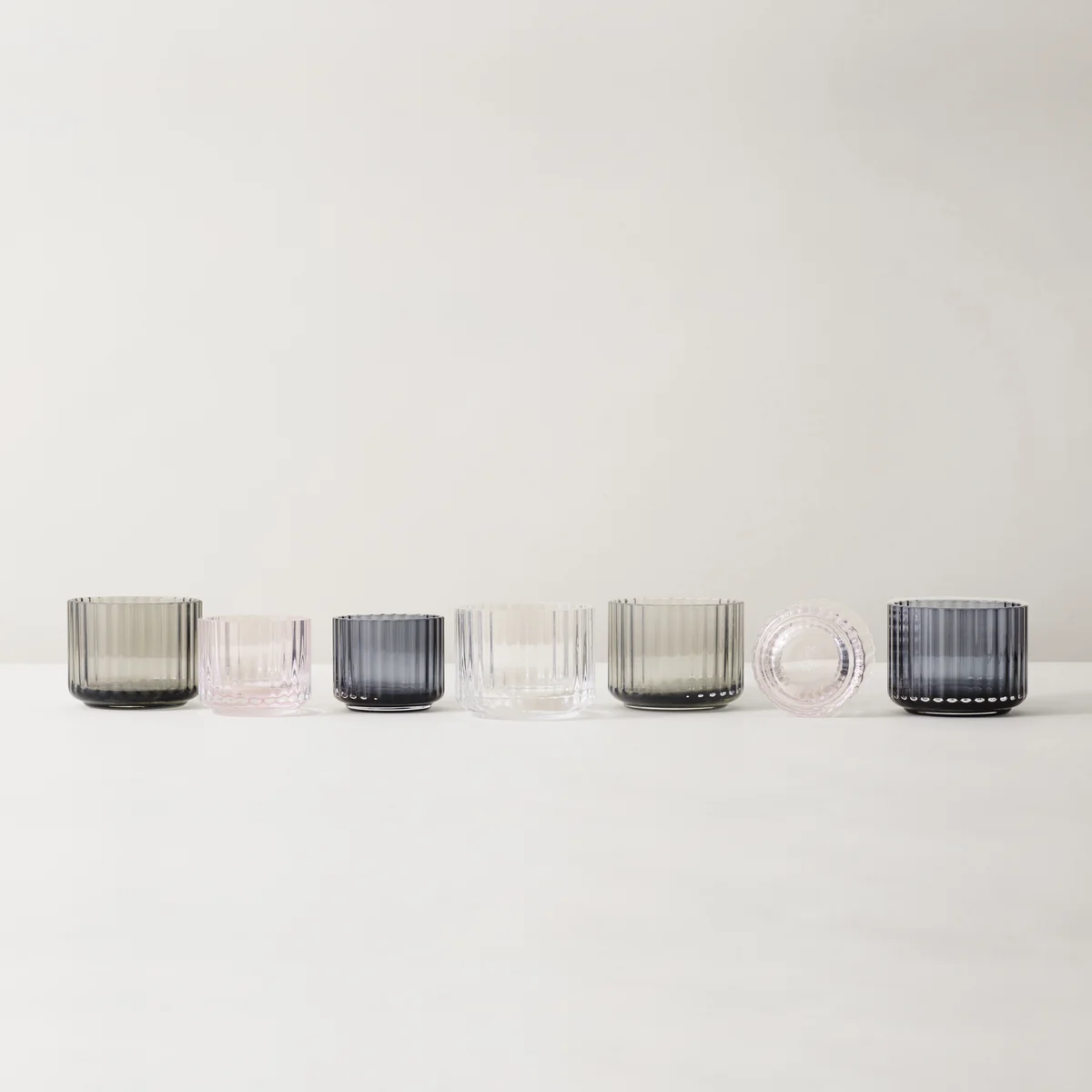Lyngby Porcelæn De Lyngby theelichthouders van mondgeblazen glas worden vervaardigd door het Deense merk . Het ontwerp wordt gekenmerkt door zijn unieke esthetiek, dankzij de geribbelde structuur. Elk theelichtje is handgemaakt van kristalglas en is uniek. Het lichtspel van de theelichtjes creëert een buitengewone levendigheid in de glazen zuilen.