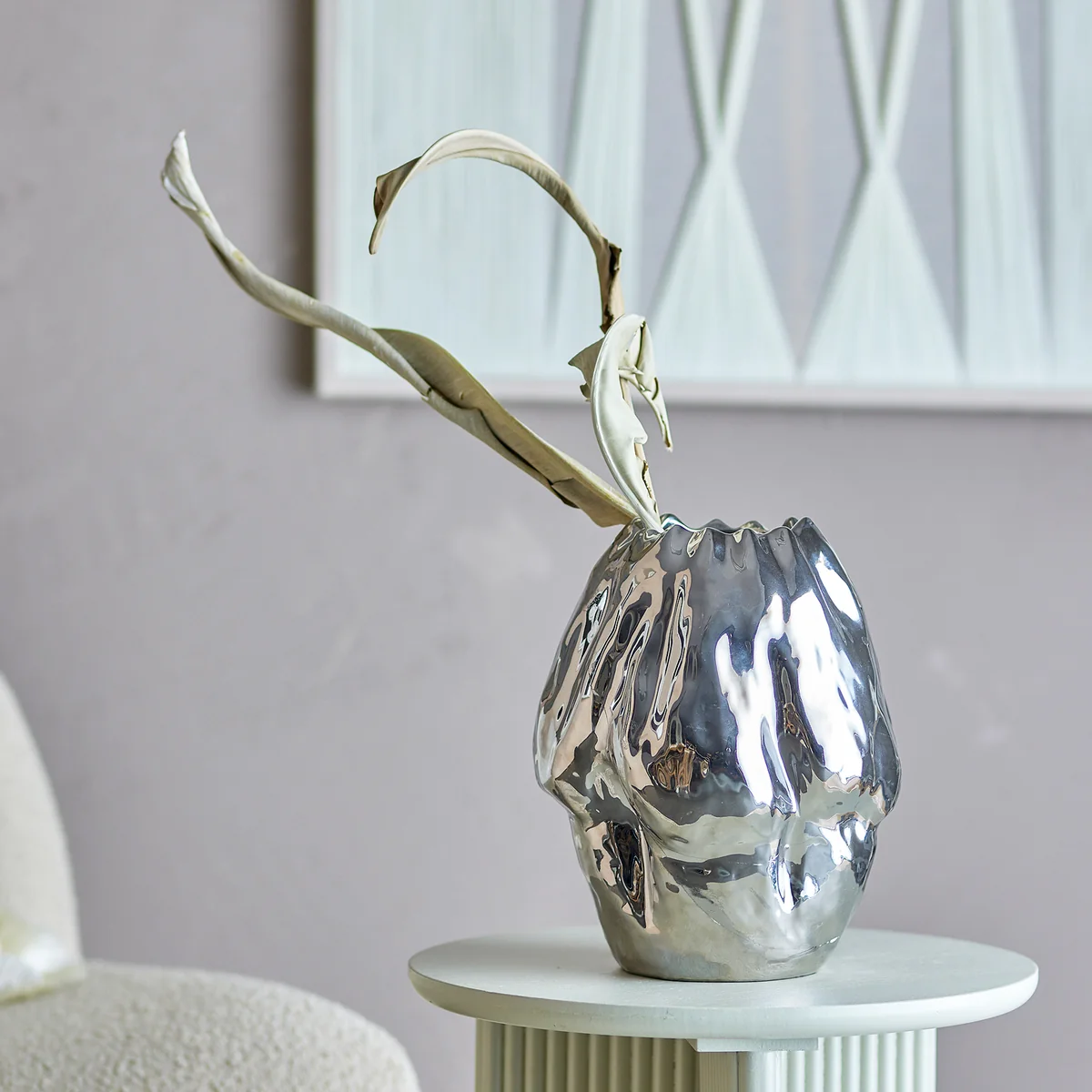 De Bobby vaas van Bloomingville combineert moderne elegantie met handgemaakte charme. Hij is gemaakt van robuust steengoed en afgewerkt met een hoogglanzend, zilverkleurig glazuur. Hij weerkaatst het licht op een stijlvolle manier en zorgt voor spannende accenten in elke kamer. De organische vorm onderstreept het artistieke karakter, terwijl natuurlijke kleurvariaties elke vaas uniek maken.