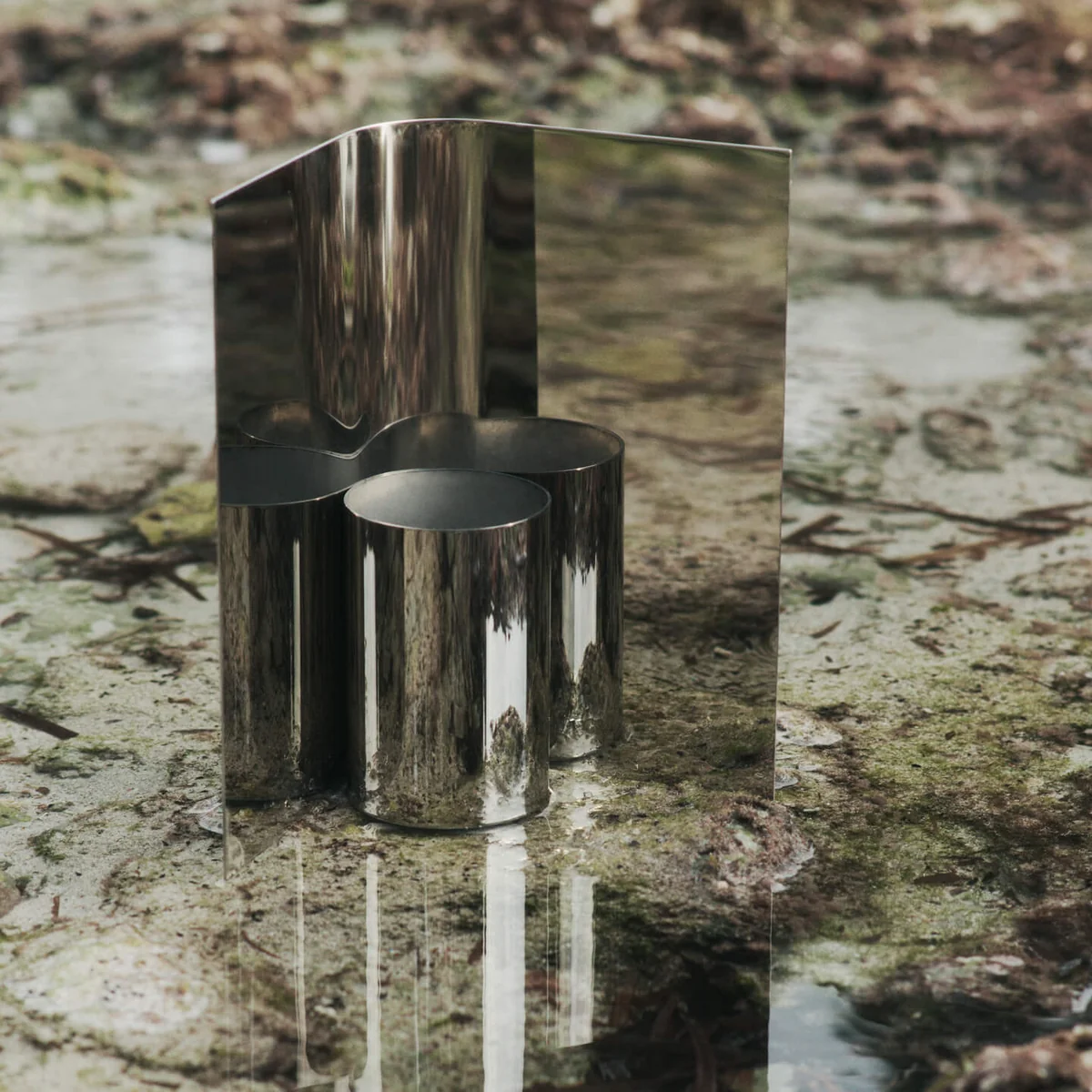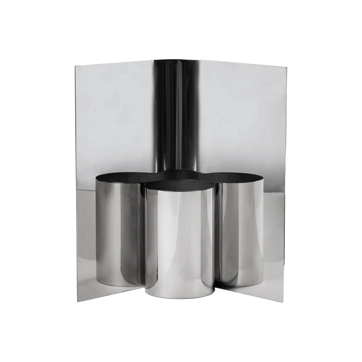 De Eddy vaas van hoogglans gepolijst roestvrij staal fascineert door zijn reflecterende oppervlak dat het licht vangt en de omgeving weerspiegelt. Het minimalistische ontwerp combineert een slanke cilinder met een concentrisch gebogen roestvrijstalen plaat die verder reikt dan de hoogte van de vaas en het ontwerp een dynamische diepte geeft. Met zijn reflecterende structuur versterkt de vaas het effect van het boeket en creëert een indrukwekkend middelpunt in elke kamer.