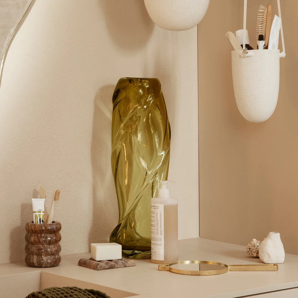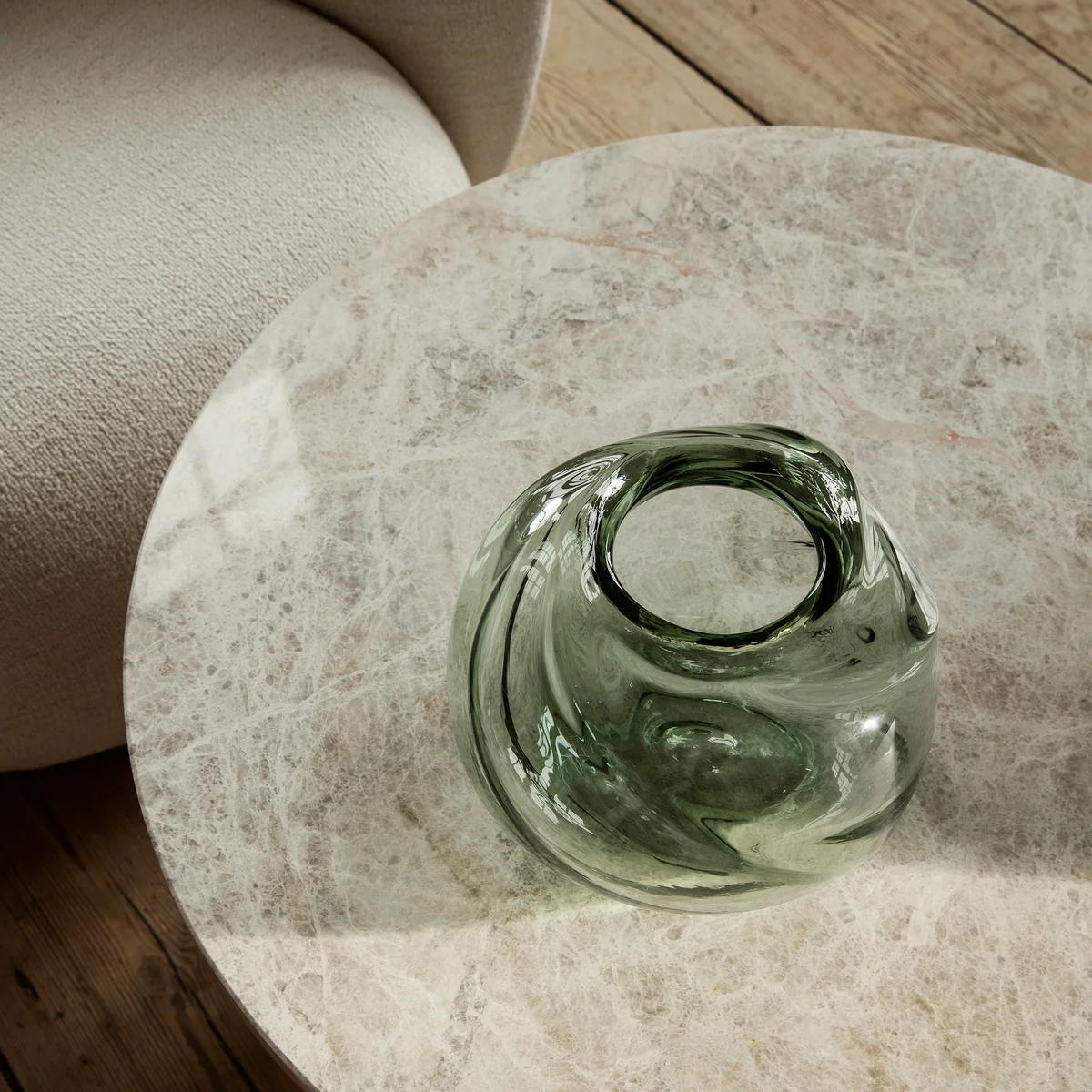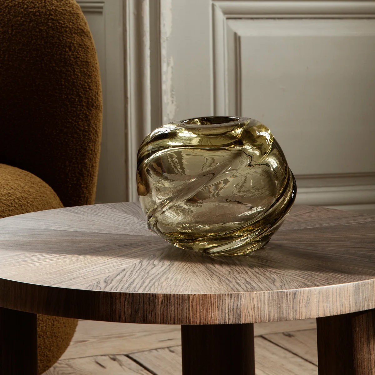 De mondgeblazen vaas Water Swirl van Ferm Living doet denken aan het gekabbel van vallend water. Dankzij het doorschijnende gekleurde glas creëert de vaas een gracieuze en natuurlijke, bijna dansende uitdrukking, hoewel hij gemaakt is van massief, massief glas.