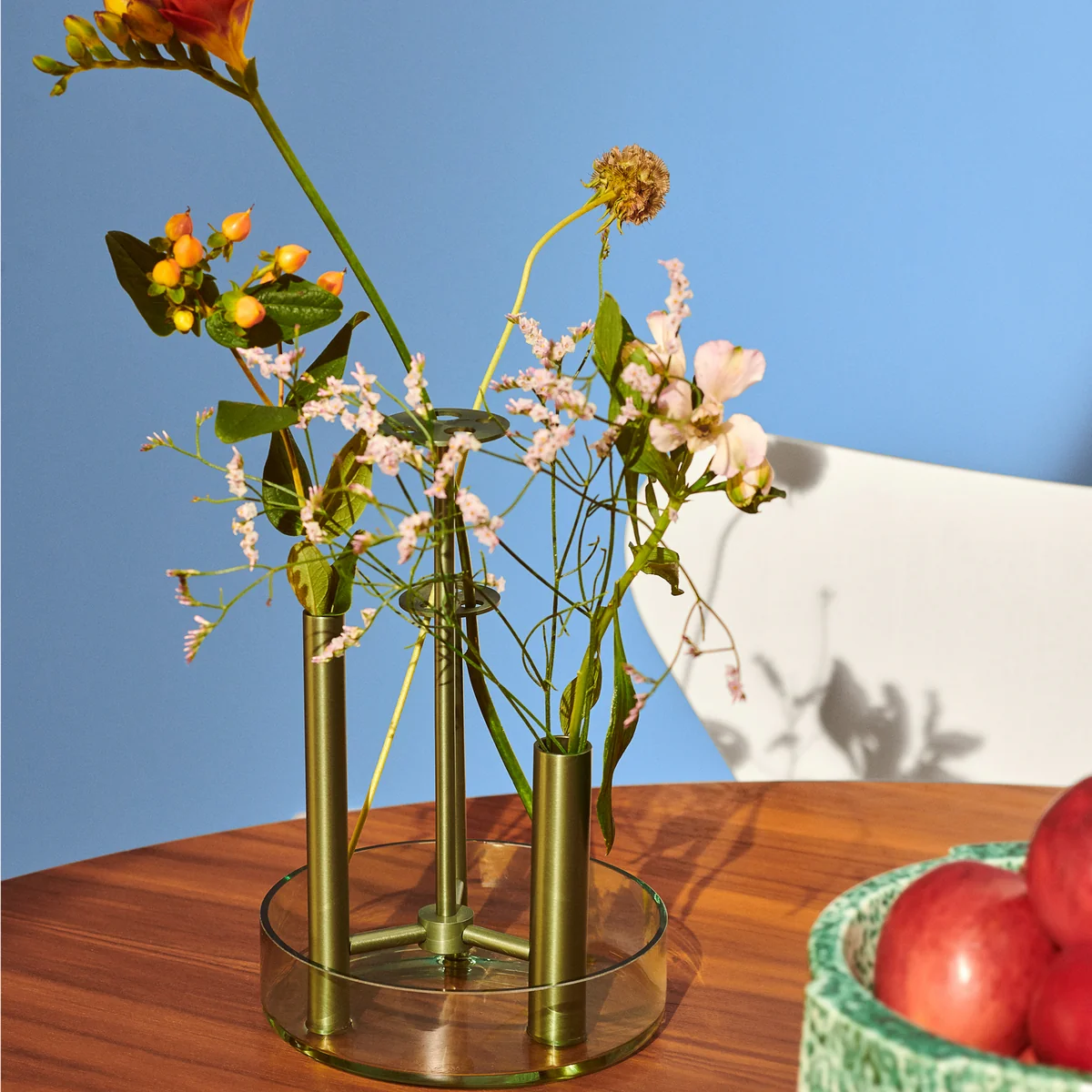 De waterbak van de Ikeru vaas is gemaakt van bosgroen glas, de buizen en het frame van aluminium. De Ikeru Vase Low is ook verkrijgbaar in een hoge versie.