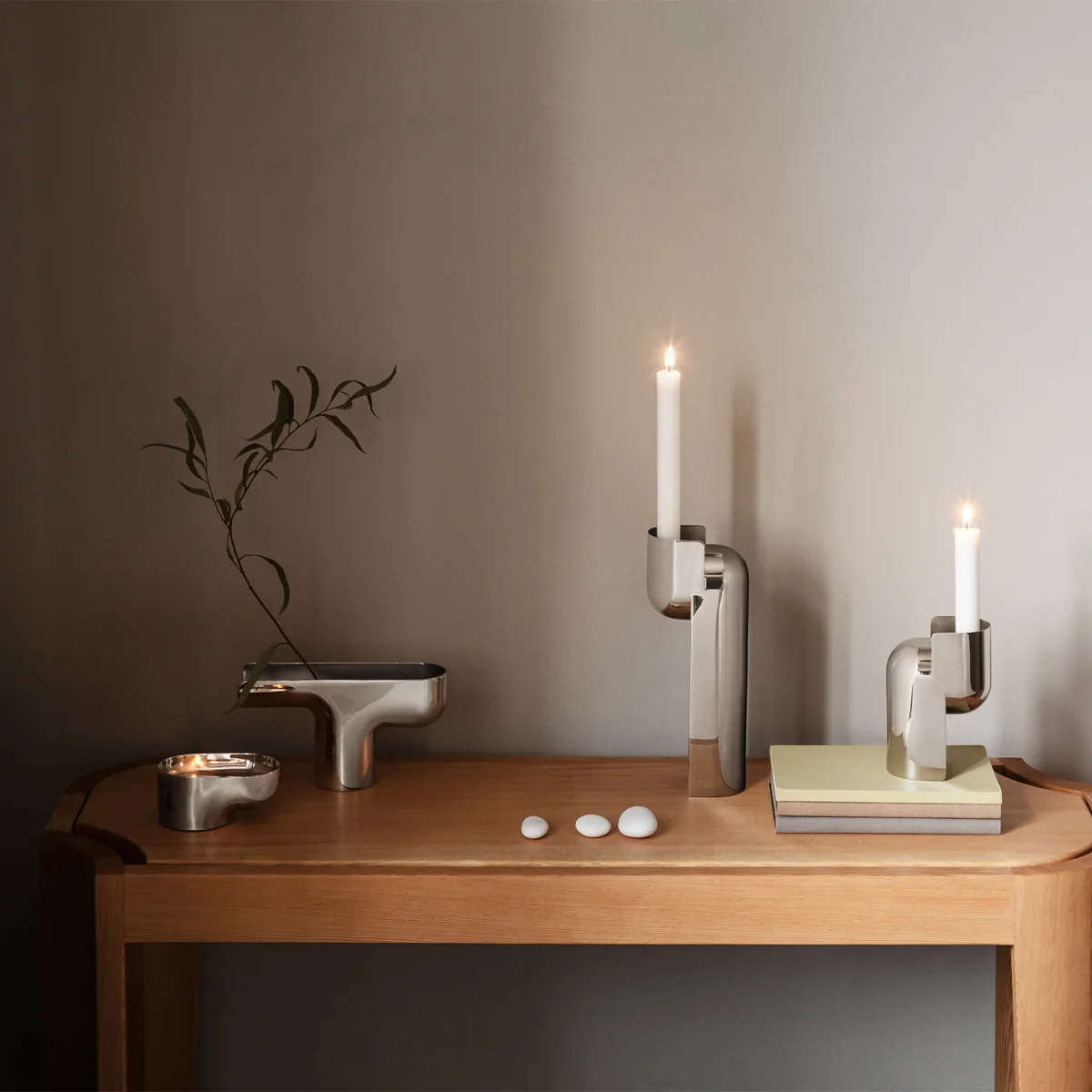 De Nendo vaas van het Deense label Georg Jensen is een buitengewoon, eigentijds designobject. Het prachtige, sculpturale object is dankzij het abstracte ontwerp een geweldige blikvanger in elke woonruimte. Nendo is gemaakt van met de hand gepolijst, massief gegoten roestvrij staal. Door het gebruik van het massieve materiaal zijn er geen zichtbare scheidingslijnen, wat het geheel een uiterst hoogwaardige uitstraling geeft. De vaas kan als zelfstandige sculptuur worden gebruikt. Het kan echter ook heel klassiek gebruikt worden voor bloemstukken.