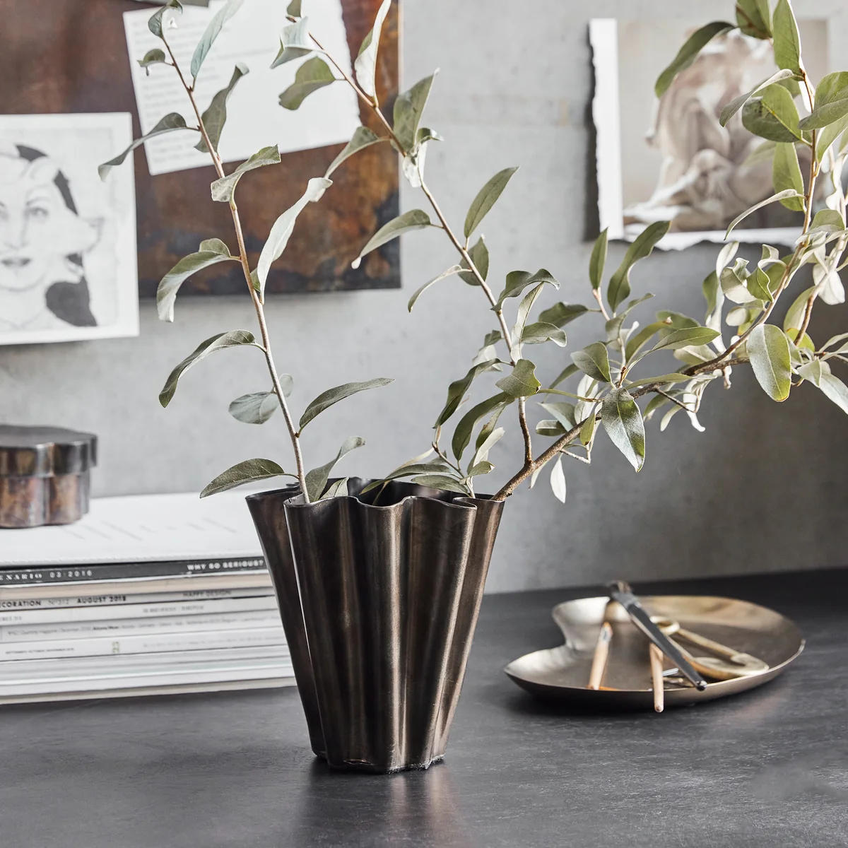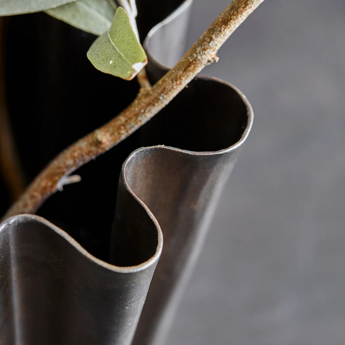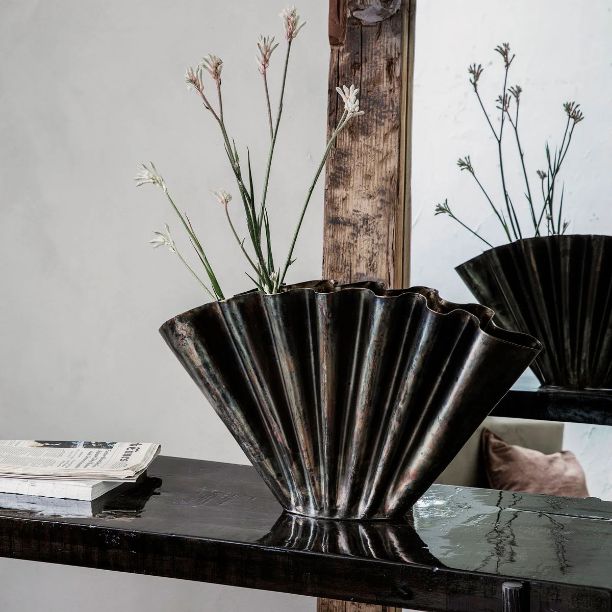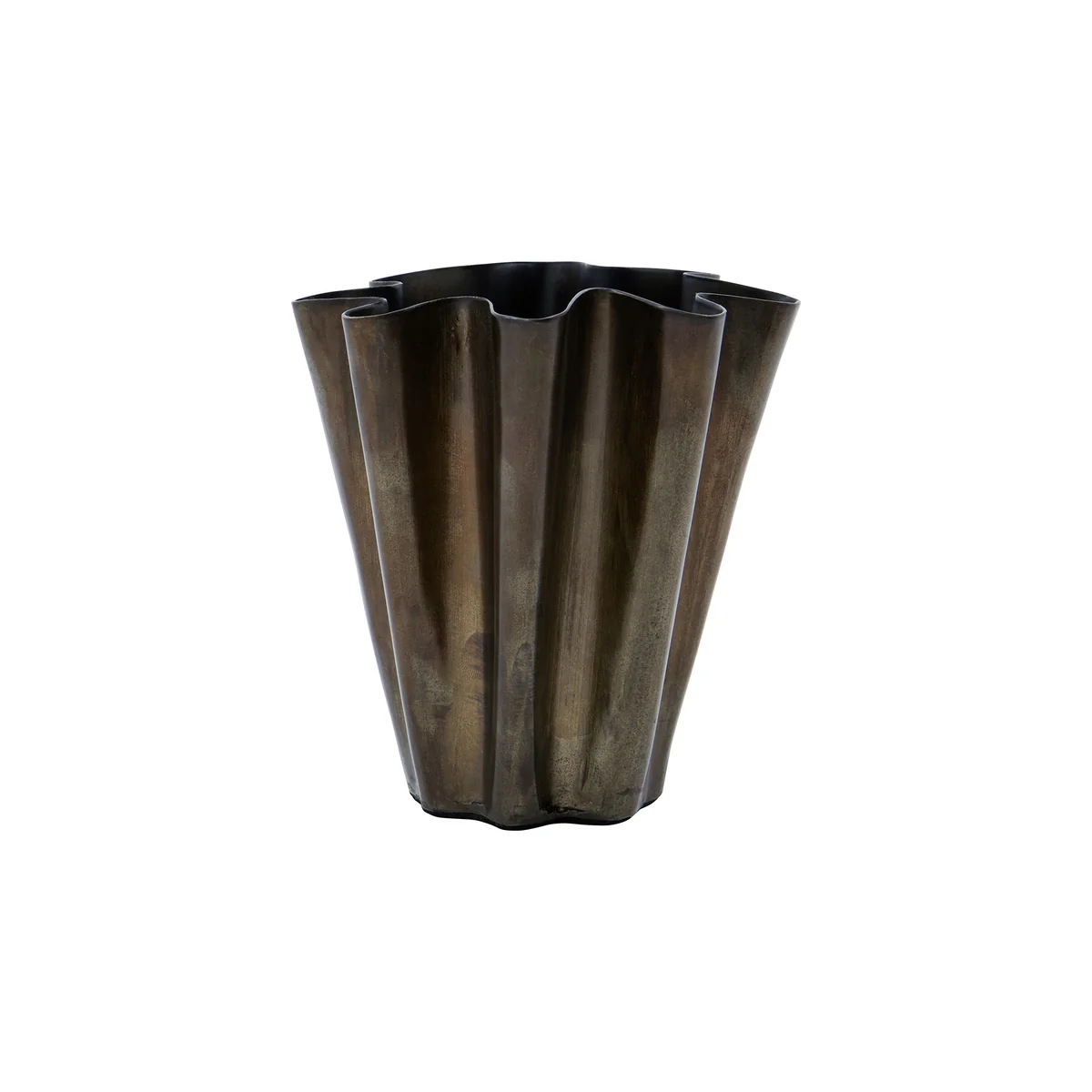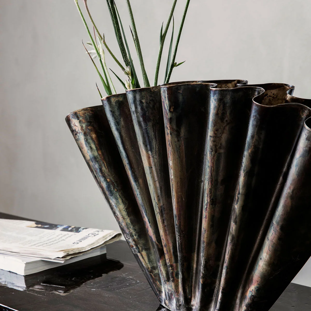 De Flood vaas van House Doctor maakt indruk met zijn ongewone vorm en industrieel ogende materiaal. De vorm van de vaas doet denken aan een schelp en de zijkanten draaien in een golfvorm. De vaas is gemaakt van ijzer en heeft een ruwe en decoratieve uitstraling, waardoor het een blikvanger is in elke woonruimte.