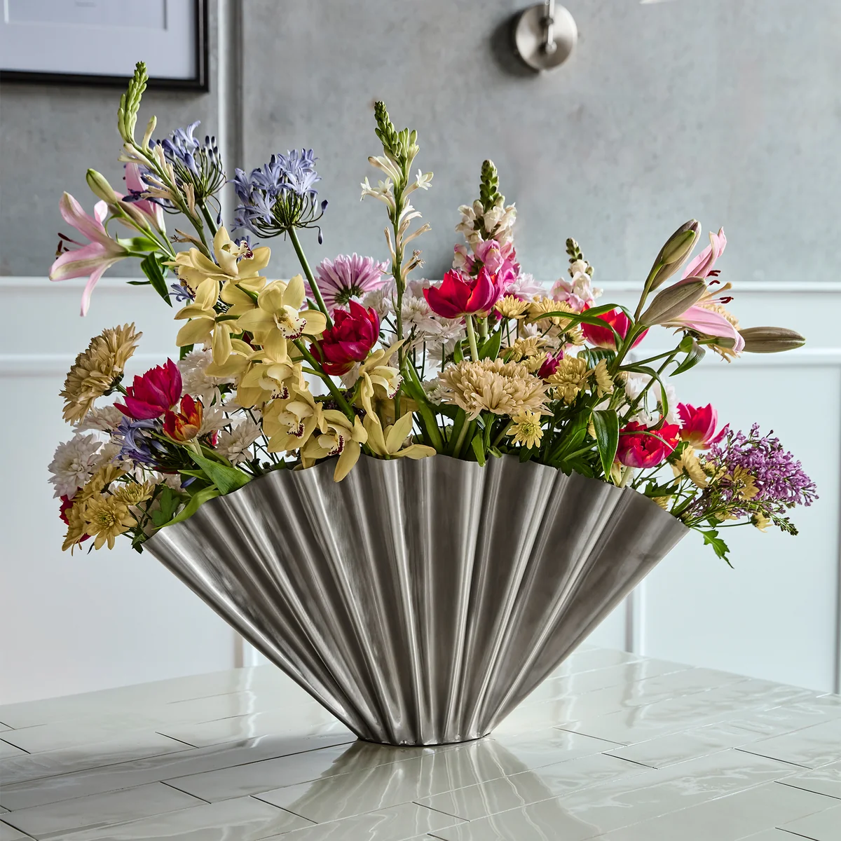 De dynamische plooien van de vaas zijn niet alleen decoratief, maar ondersteunen ook de strengen bloemen. Dit betekent dat de vaas gebruikt kan worden om zowel losse bloemen en struiken als uitbundige boeketten stijlvol te schikken.