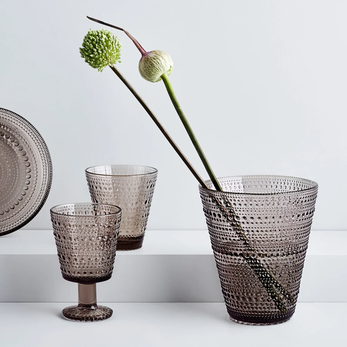 Ontworpen in 1964 door de Finse glasontwerper Oiva Toikka, onderscheidt Kastehelmi zich door zijn natuurlijke schoonheid. Kastehelmi vertaald betekent dauw die perfect het patroon van de vaas beschrijft. De stippen, die op kleine waterkralen lijken, zijn vakkundig rond het glazen vat geplaatst en vormen met hun reflecterende oppervlak een echte blikvanger.