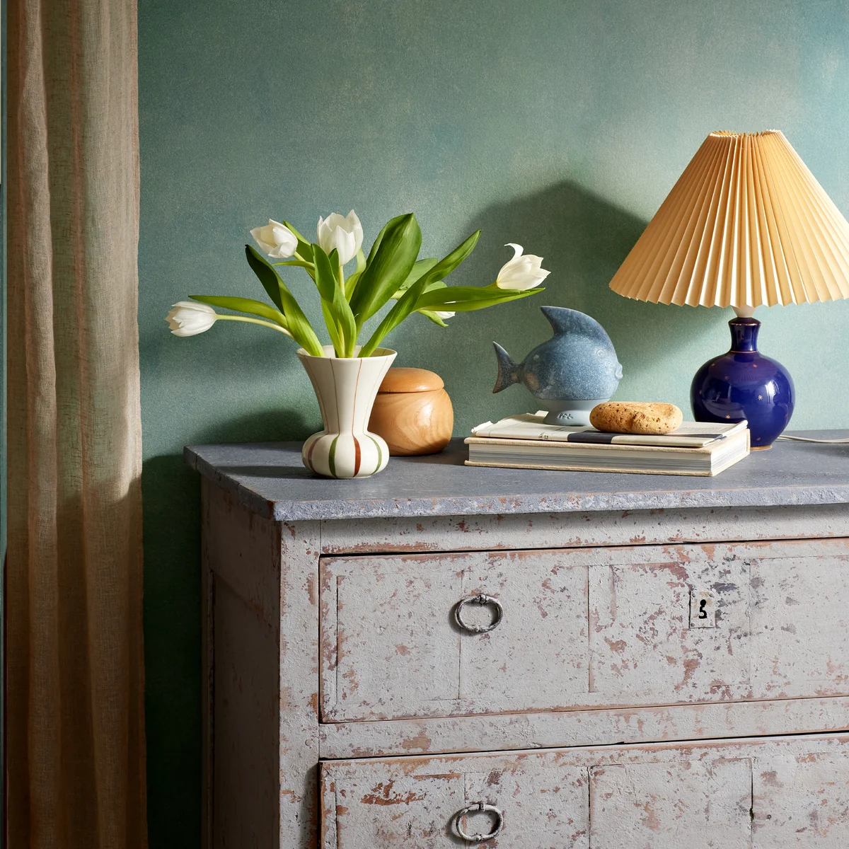 Een grappig detail zijn de karakteristieke lijnen die doorlopen over de rand en in de binnenkant van de vaas. Dit is niet alleen elegant en verrassend, maar voegt ook een nieuwe dimensie toe aan het ontwerp, omdat de vorm zowel van binnen als van buiten wordt geaccentueerd. De vaas is gemaakt van keramiek en met de hand beschilderd. Dit draagt bij aan de levendigheid van de authentieke charme, die ook wordt gecreëerd door de grafische interpretatie van bloemen en zaadkoppen op de vazen.