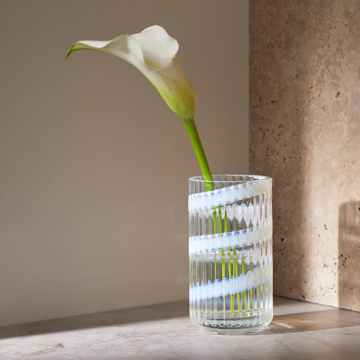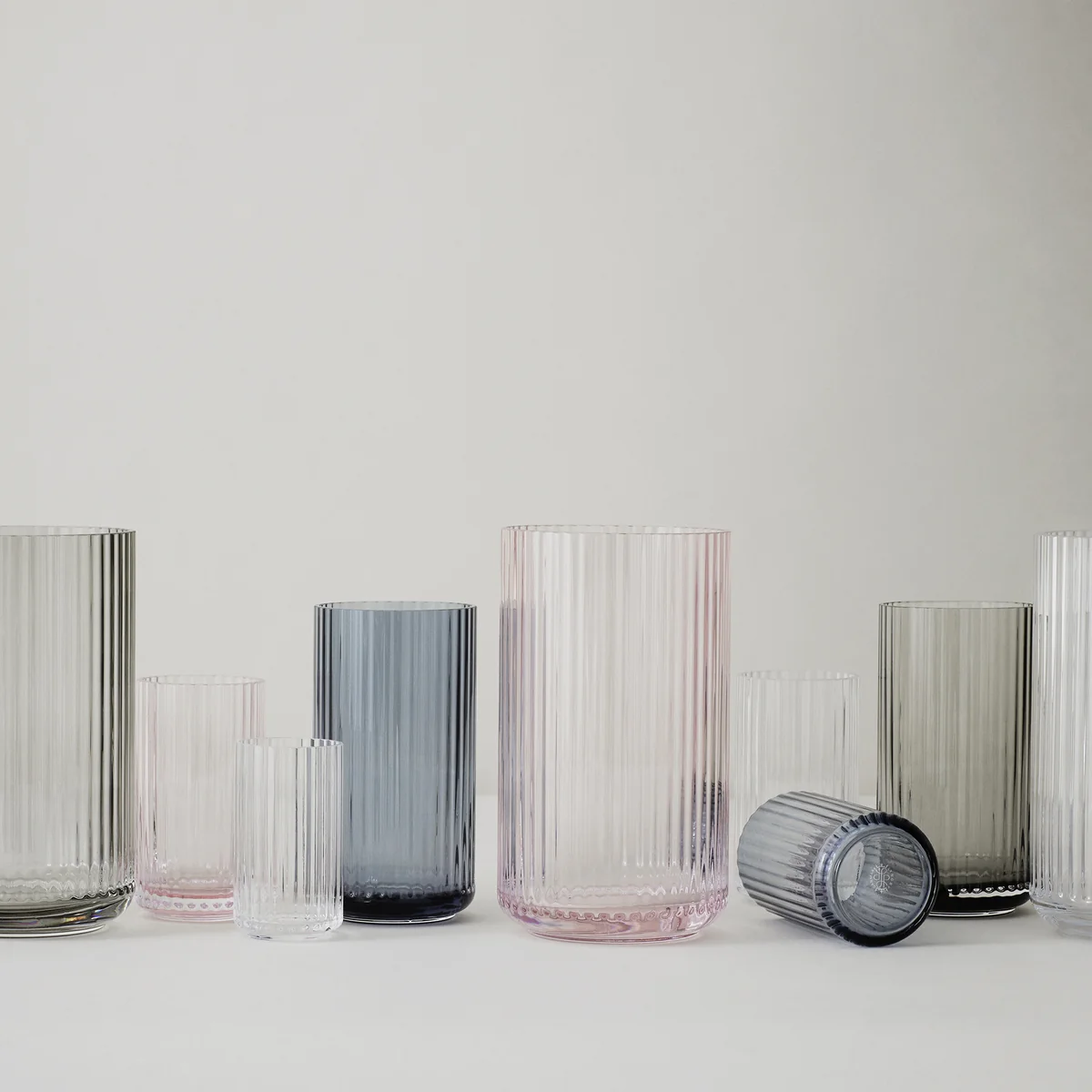 De klassieke Lyngby vaas werd in 1936 ontworpen en opnieuw geïnterpreteerd als een glazen versie. Net als het porseleinen origineel heeft de glazen vaas een unieke esthetiek dankzij de geribbelde structuur. Het lichtspel op de glazen kolommen creëert een buitengewone levendigheid. De vaas is ideaal voor kleinere boeketten, decoratieve takken of als stand-alone sculptuur.