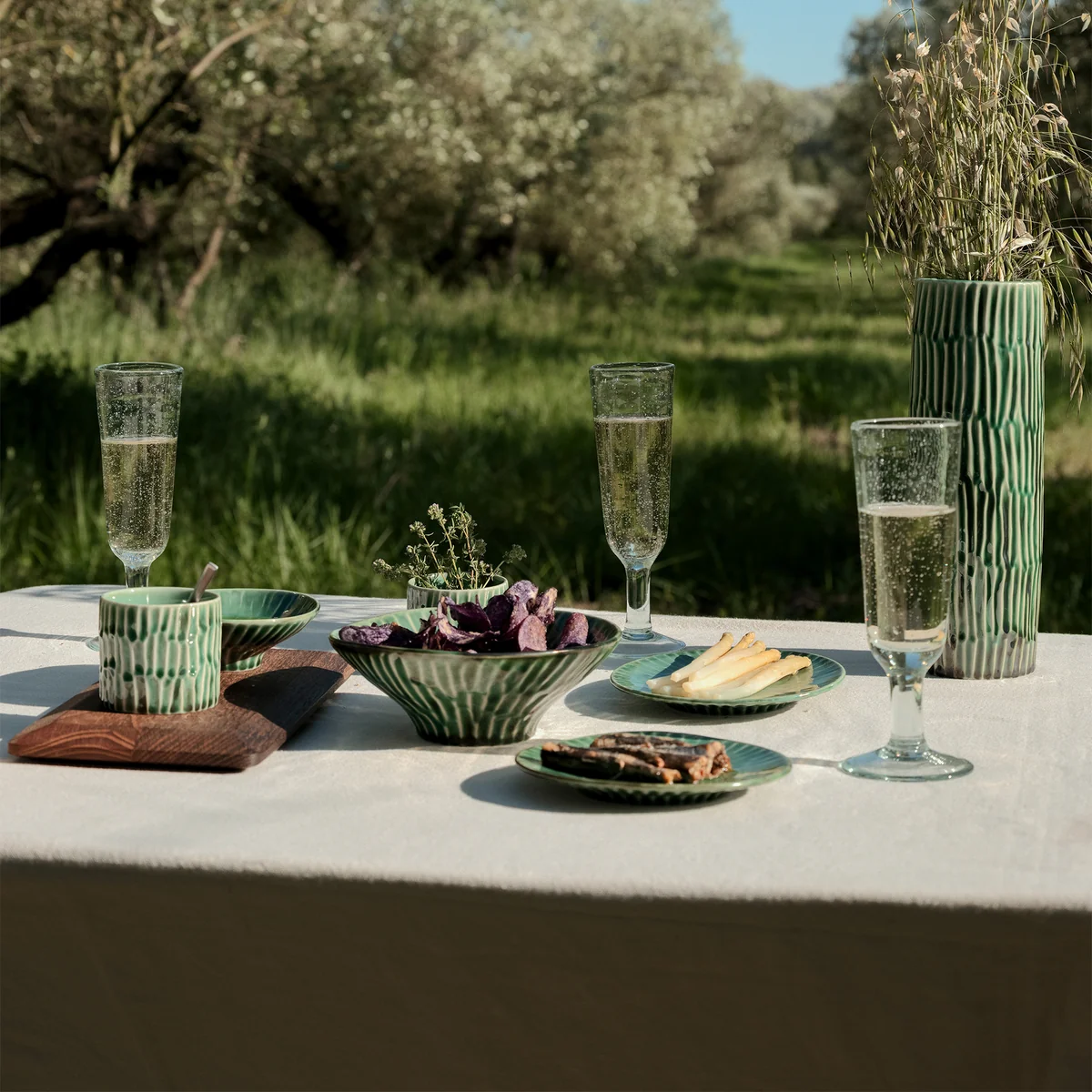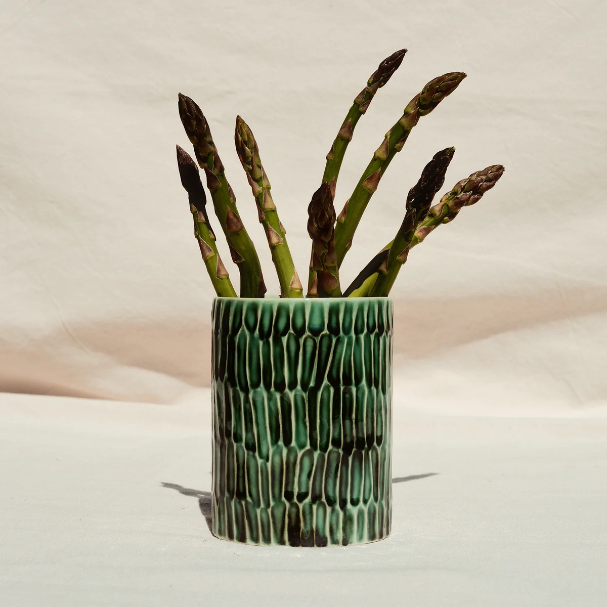 De Verde Lanza vaas van Pascale Naessens voor Serax combineert functionaliteit met een expressief ontwerp. De vaas is gemaakt van steengoed en is geïnspireerd op de groene ramen, deuren en vegetatie op Lanzarote, waar de ontwerpster vaak woont. Het zongebruinde glazuur in een natuurlijke groene tint wordt versterkt door een schelpachtige textuur die Naessens zelf met haar vingers heeft aangebracht. Of het nu om kookgerei, bestek of bloemen gaat - de vaas is een veelzijdig accessoire dat de keuken en eethoek op een stijlvolle manier verrijkt.