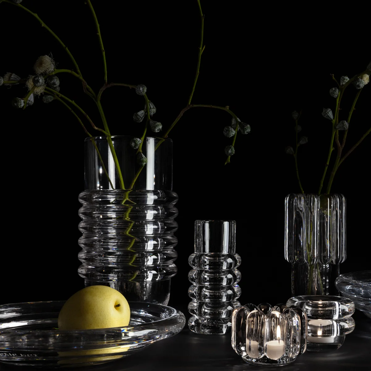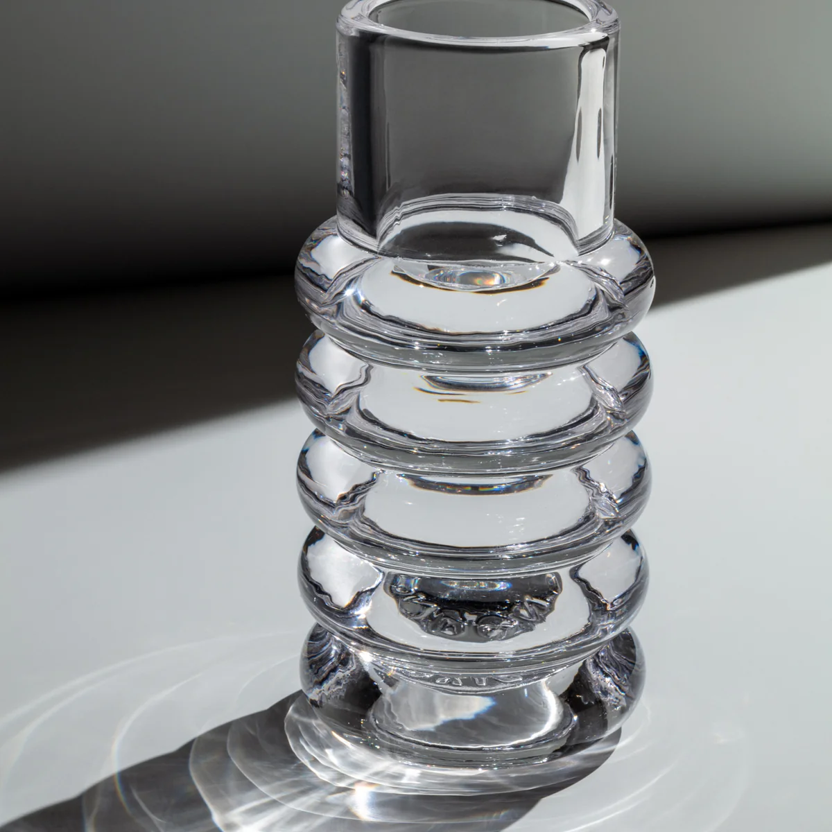 De Press De vaas van Tom Dixon is al een echte blikvanger, zelfs zonder bloemen: het licht wordt opgevangen in de dikke glasgroeven voordat het breekt in spectaculaire reflecties. Gevuld met bloemen of twijgen vullen de natuurlijke schoonheid van de bloemen en de sculpturale, artistieke charme van de vaas elkaar aan om een spannend totaalspel te creëren.