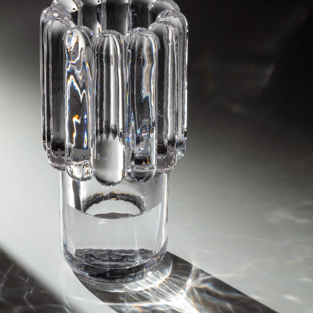 De stukken van de Tom Dixon Press series zijn geen alledaagse glazen voorwerpen. Ze zijn ontworpen om het licht te breken, te weerkaatsen, ermee te spelen en eeuwig mee te gaan. De stukken van de Press De series zijn gemaakt van het dikst mogelijke glas en zijn uiterst robuust. Ze danken hun naam aan hun productie: dikke glazen bollen bij 1200 graden Celsius worden in metalen mallen gedropt en in de gegroefde mallen geperst. Eenvoudig ontwerp, opwindend licht, dik glas, en dat voor altijd: de Press serie van Tom Dixon staat voor glasontwerp van meesters.
