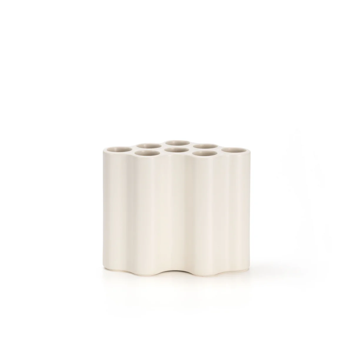 De vorm van de Nuage vazen is al terug te vinden in de archieven van de gebroeders Ronan en Erwan Bouroullec in 2002. Dankzij de bijzondere buisvorm is de geanodiseerde aluminium versie een integraal onderdeel van het Vitra-programma geworden. Nu presenteert de Zwitserse fabrikant het populaire keramische accessoire. Elk van de vazen is een uniek exemplaar en zet unieke accenten op de vensterbank of dressoir van het huis.