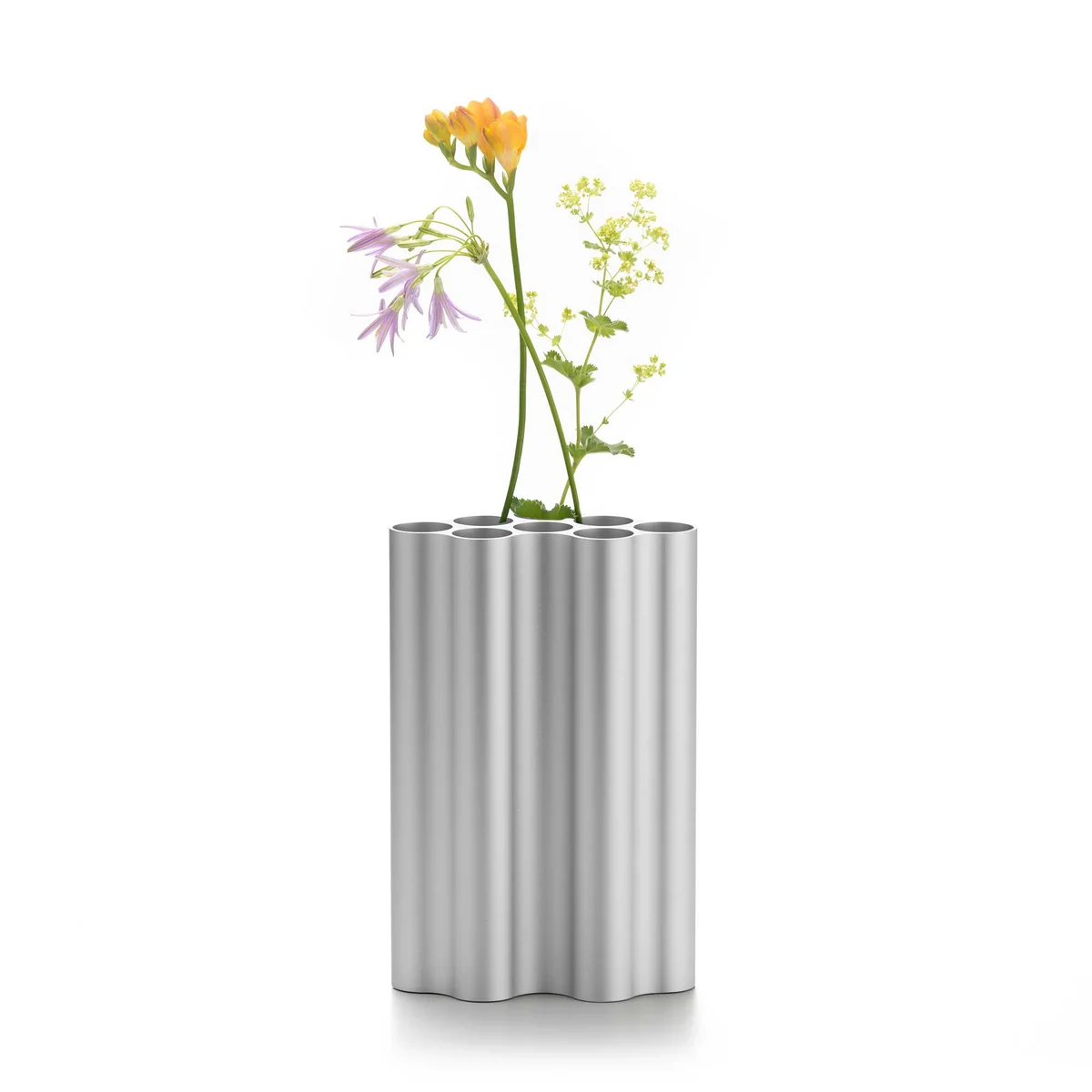 Voor de vaas Nuage tekenen de ontwerpers de wolkenvorm uit massieve aluminium profielen in verschillende lengtes. Nu wordt de basisvorm gebruikt terwijl men staat, de vaas is dus verdeeld in acht afzonderlijke buizen, die verschillende arrangementen van bloemen en grassen kunnen huisvesten. De gekleurde geanodiseerde, golvende oppervlakken creëren een charmant spel van licht en schaduw.