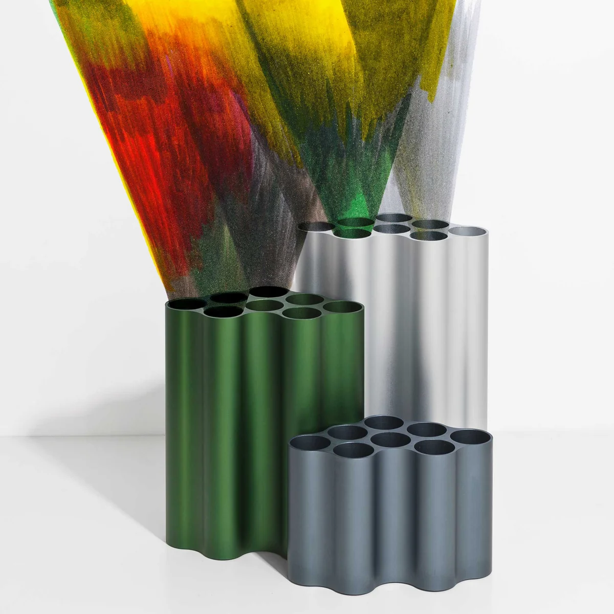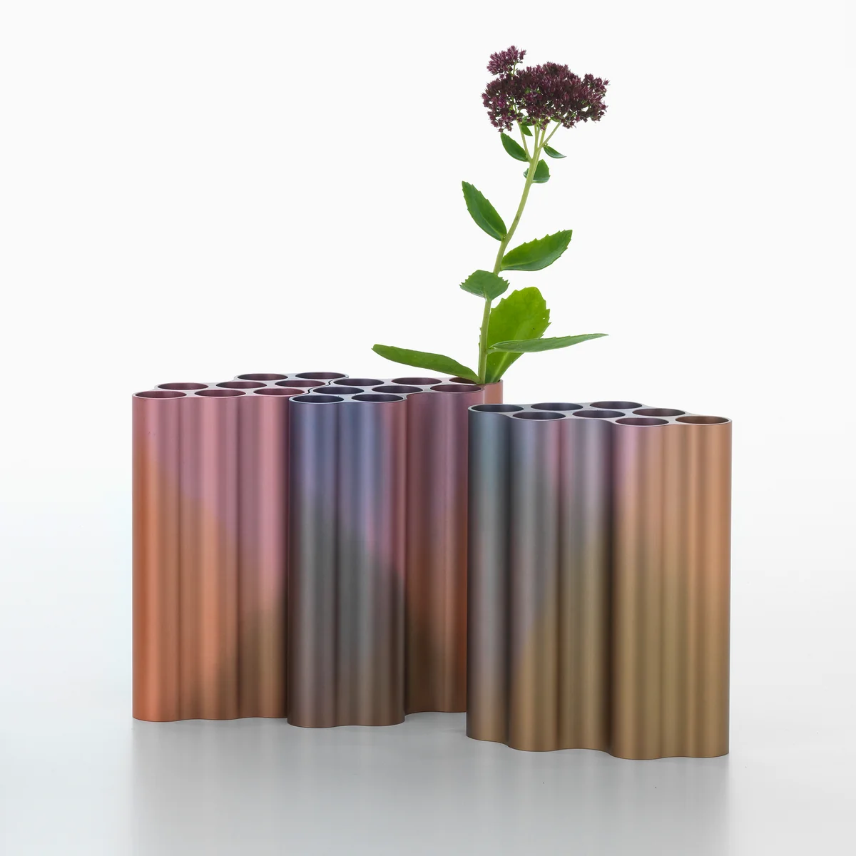 Voor de vaas Nuage tekenen de ontwerpers de wolkvorm uit massieve aluminium profielen in verschillende lengtes. De basisvorm wordt nu rechtopstaand gebruikt, waarbij de vaas in acht afzonderlijke buizen wordt verdeeld waarin arrangementen van bloemen en grassen kunnen worden geplaatst. De gekleurde geanodiseerde, golvende oppervlakken creëren een charmant spel van licht en schaduw.