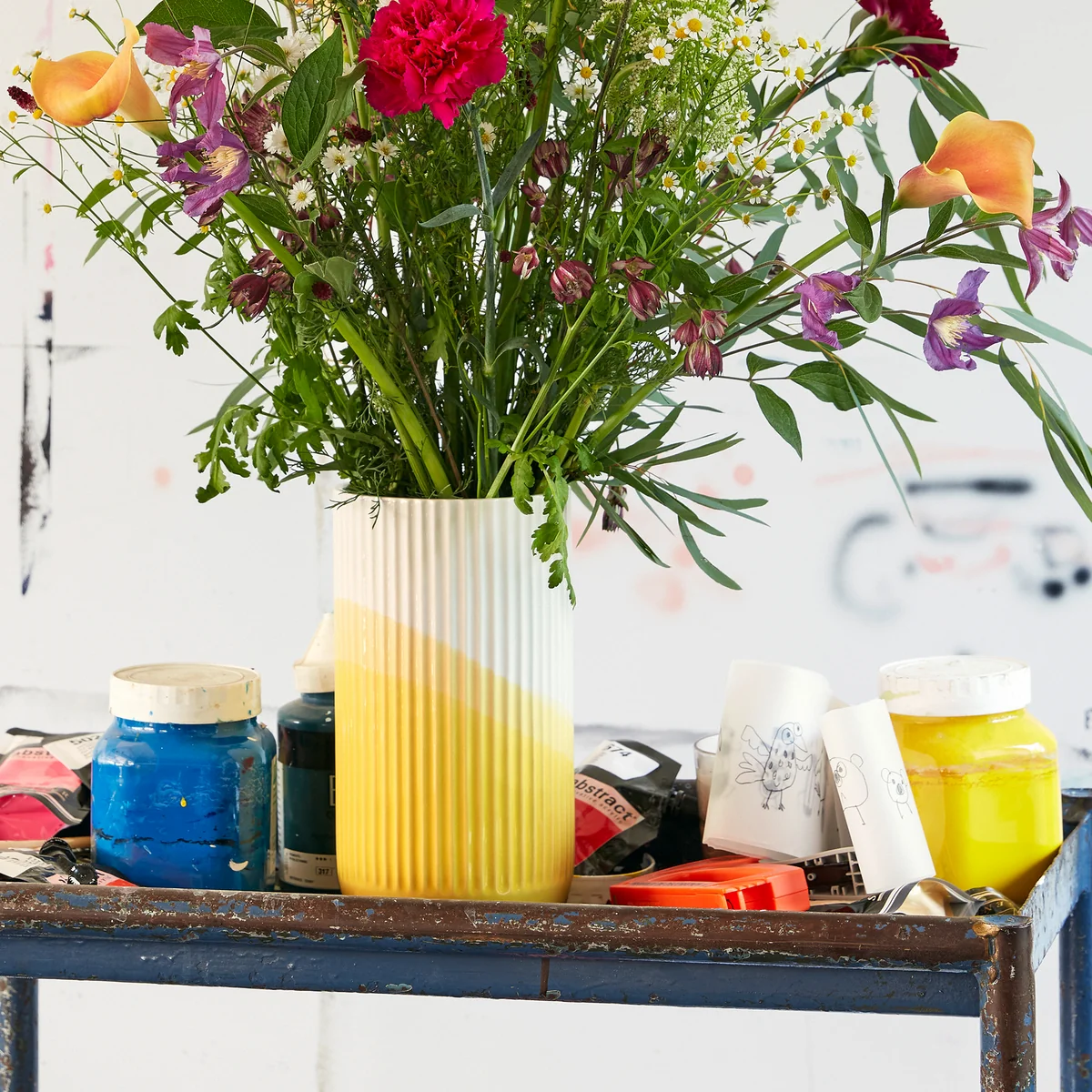 De vaas is gemaakt van keramiek met een glad of geribbeld oppervlak. Voor de afwerking wordt de vaas in een gekleurd glazuur gedompeld. Door dit proces onder verschillende hoeken te herhalen, ontstaat de bijzondere, onregelmatige uitstraling. Het kleurenspel wordt met de hand gemaakt, waardoor elke vaas uniek is. De visgraatvaas is een echte blikvanger op tafel of op het schap, of hij nu met planten is gezet of op zichzelf staat.
