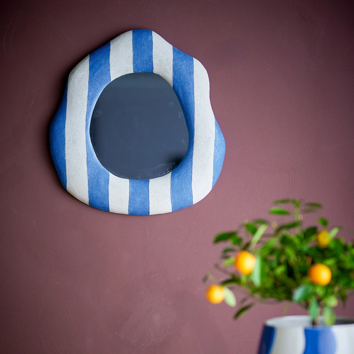 De Travis wandspiegel van Bloomingville is een buitengewoon designobject voor moderne woonruimtes. Met zijn gestreepte frame van blauw en lichtbeige polyresin in een organische vorm brengt hij een frisse wind door de muur - of het nu in de gang, woonkamer of slaapkamer is.