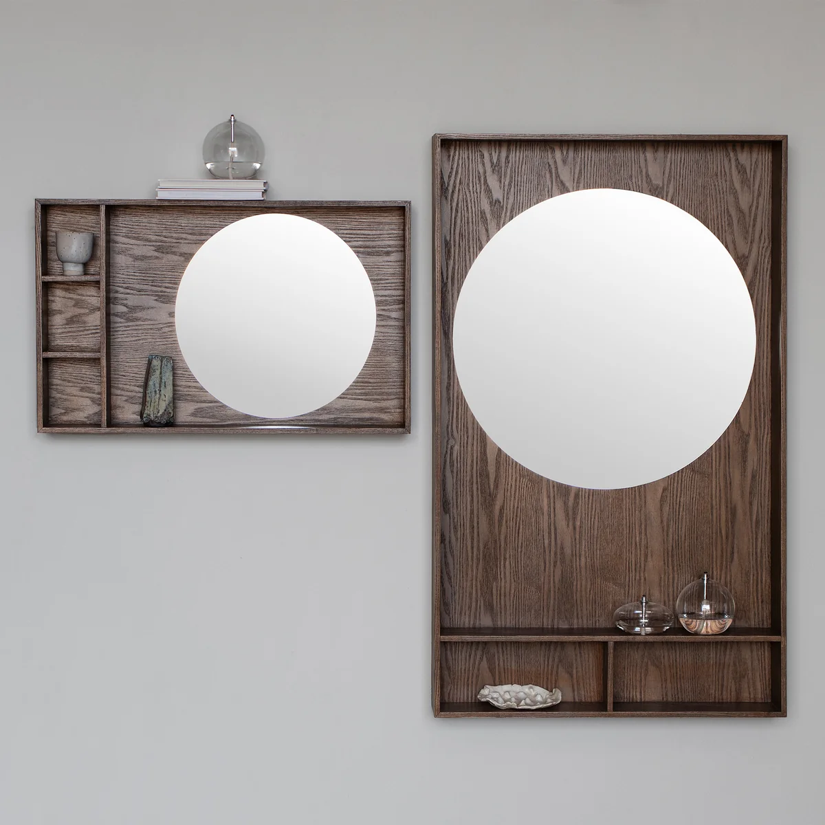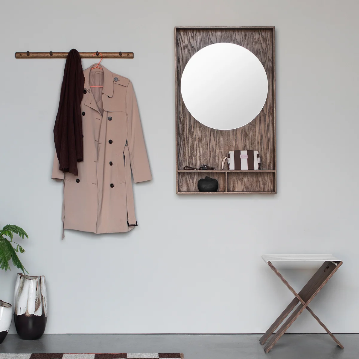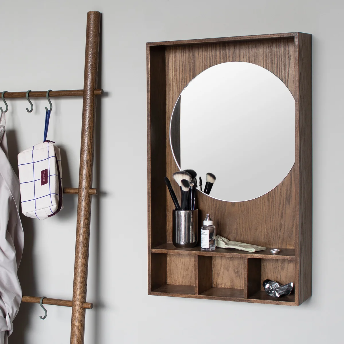 De SHOW-ME spiegel met legplank van Mette Ditmer herinterpreteert de klassieke spiegelplank uit de jaren 70 en combineert nostalgische charme met hedendaagse functionaliteit. De grote, ronde spiegel wordt aangevuld door een plank en twee kleine opbergvakken - een stijlvolle combinatie van spiegel en opbergruimte.