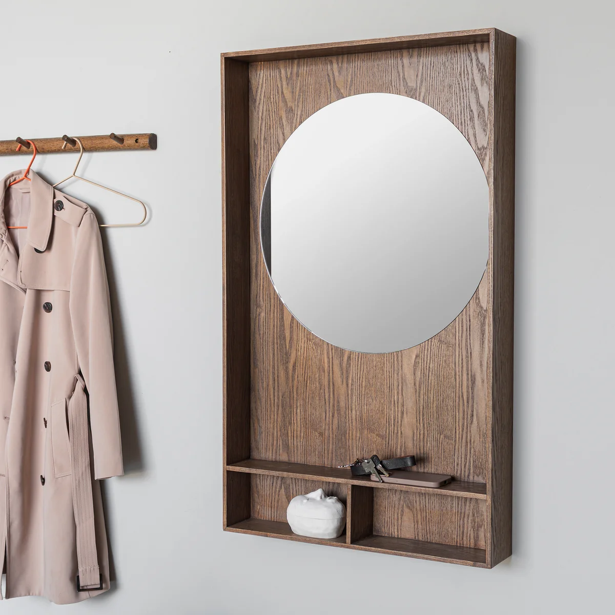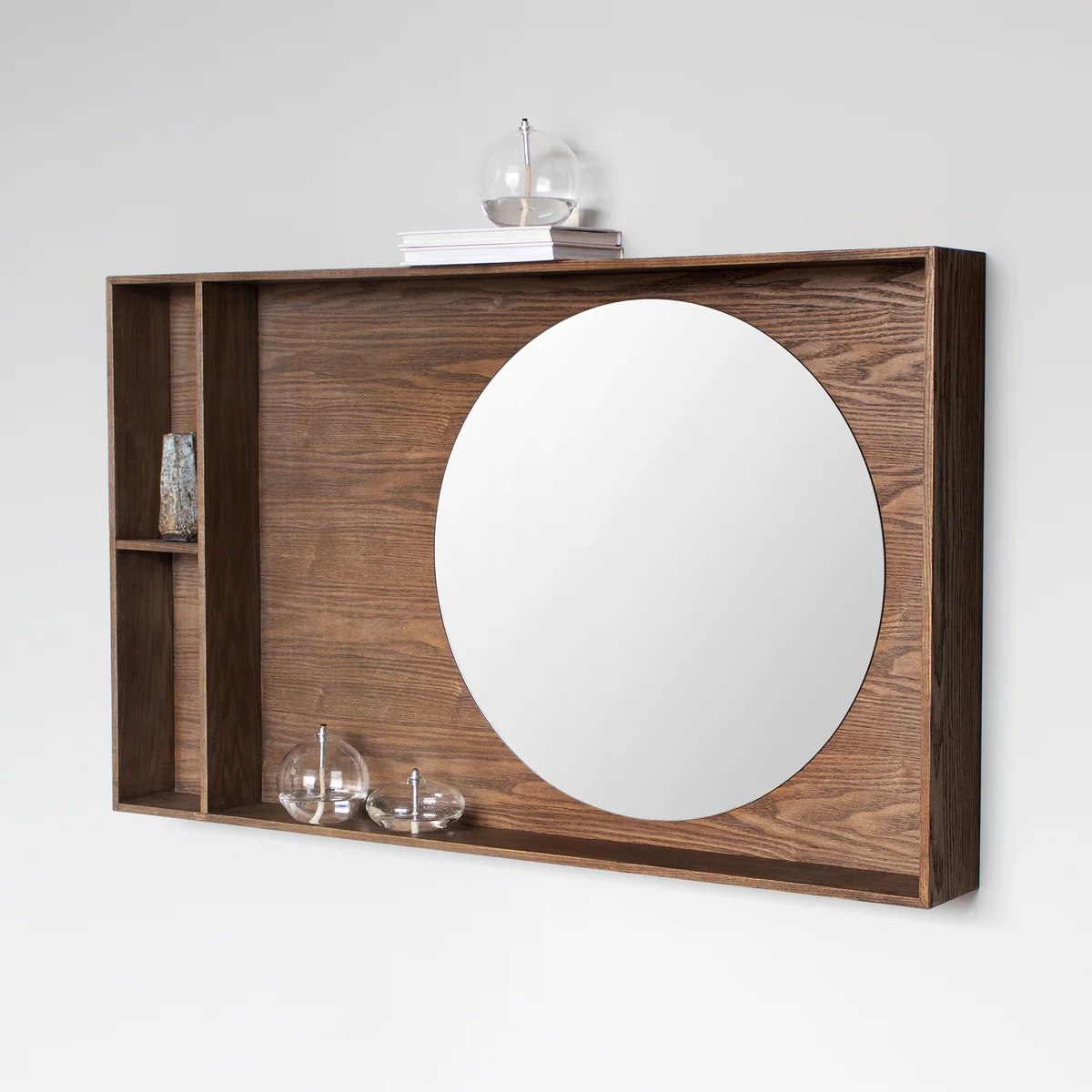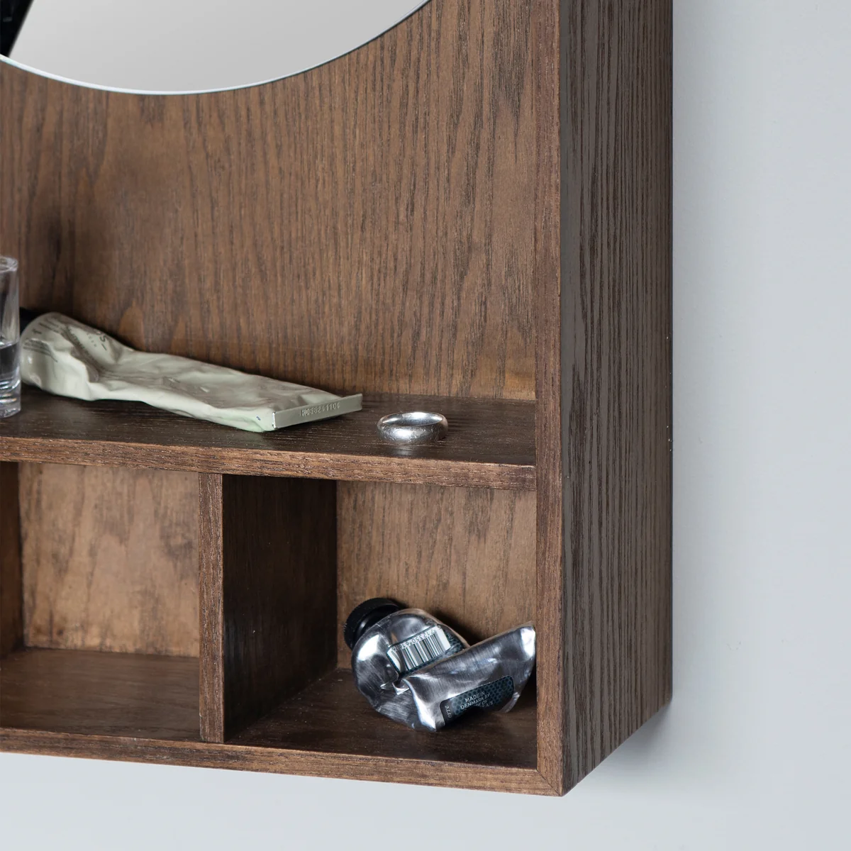 De SHOW-ME spiegel met legplank van Mette Ditmer herinterpreteert de klassieke spiegelplank uit de jaren 70 en combineert nostalgische charme met hedendaagse functionaliteit. De grote, ronde spiegel wordt aangevuld door een plank en twee kleine opbergvakken - een stijlvolle combinatie van spiegel en opbergruimte.
