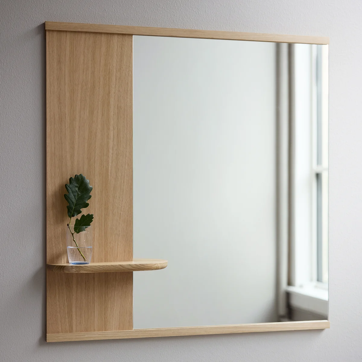 Een functioneel en elegant ontwerp combineert een spiegel en een plank in één veelzijdig meubelstuk van eikenhout en glas. Perfect voor moderne interieurs, kan flexibel worden aangepast en is ideaal voor vochtige omgevingen zoals badkamers.