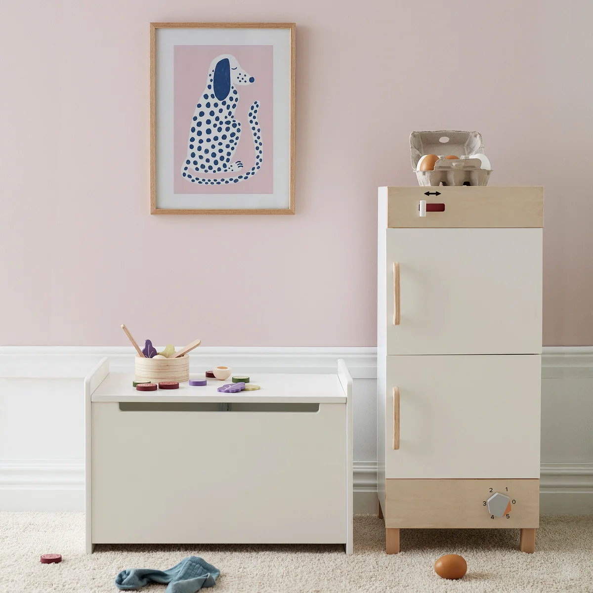 Met zijn royale afmetingen biedt de kist genoeg ruimte voor speelgoed, knuffels, boeken en nog veel meer. Het tijdloze ontwerp past naadloos in elke kinderkamer en kan zelfs worden gebruikt als extra zitplaats of als decoratief element.