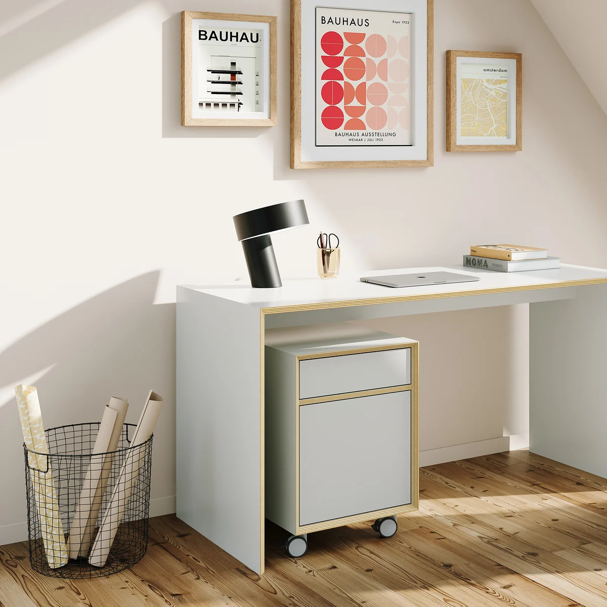 De Bridge rolcontainer combineert hoogwaardig design en functionaliteit en is ideaal voor kantoor- of thuiskantooroplossingen. Dankzij de twee vergrendelbare wielen kan de lade flexibel worden geplaatst en veilig worden vastgezet. Het heeft een bovenste lade met push-to-open en slowmotion functie en een deur met push-to-open, die leidt naar een interieur met een plank. De in verstek verlijmde constructie van 18 mm berkenmultiplex met CPL- of HPL-coating garandeert stabiliteit en duurzaamheid. De optie om de sokkel te combineren met een bureauplank maakt hem bijzonder praktisch.