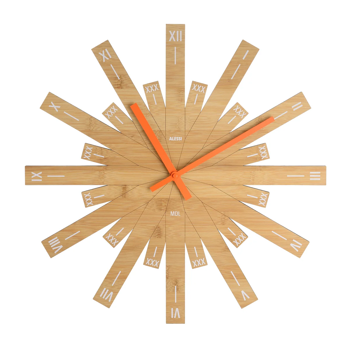 De Raggiante wandklok van Alessi is gemaakt van bamboehout. "Raggiante" betekent stralend, verwijzend naar de twaalf lange zonnestralen die de uren vertegenwoordigen. Tussen de langere stralen zijn twaalf kleinere rechthoekige stralen te zien. De handen zijn helder oranje van kleur en vullen het beeld van de zon perfect aan.