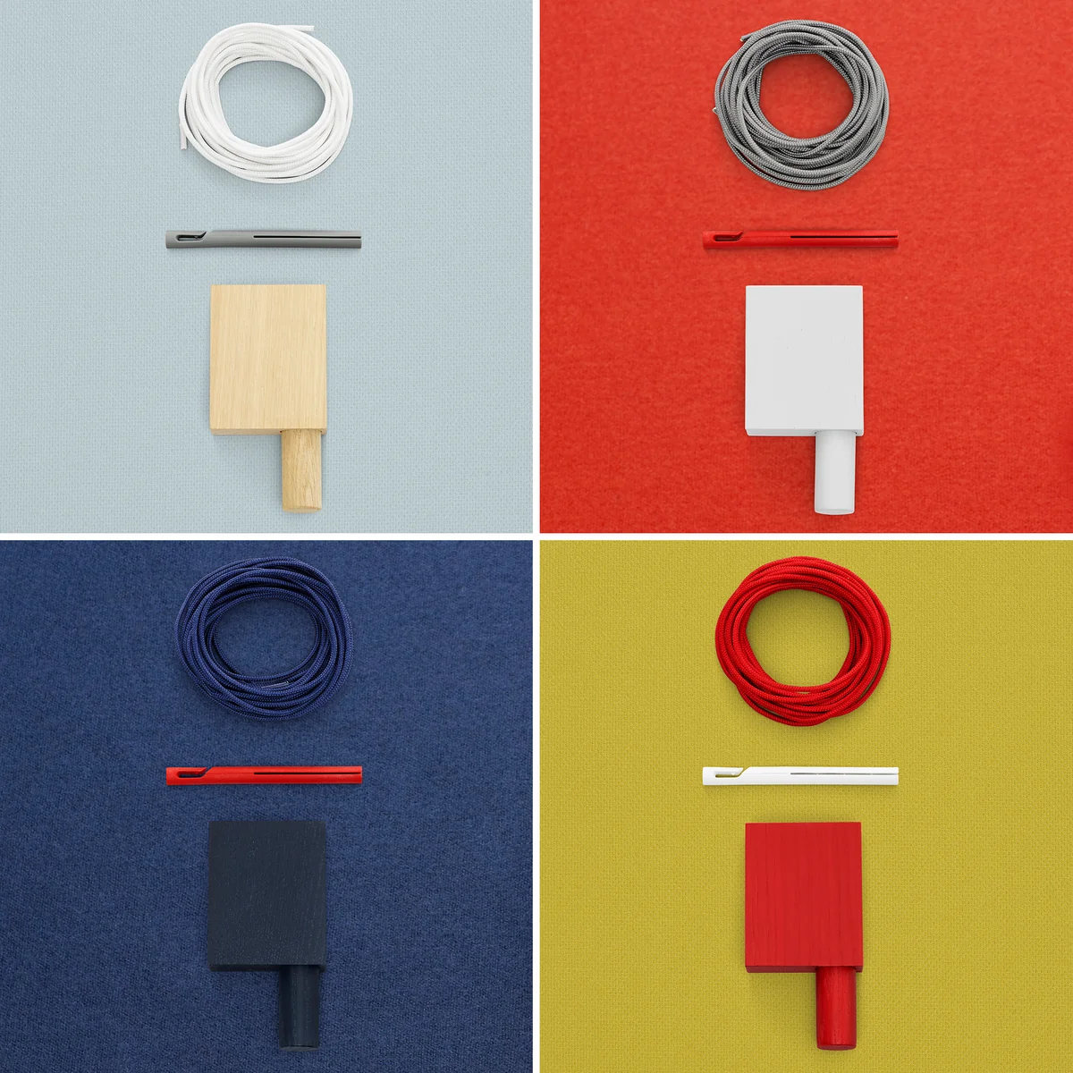 Het ophangmechanisme van het Ready Made Curtain van Kvadrat bevat een koord en een ophangmechanisme in eikenhout. Het kan aan de muur of aan het plafond worden bevestigd.