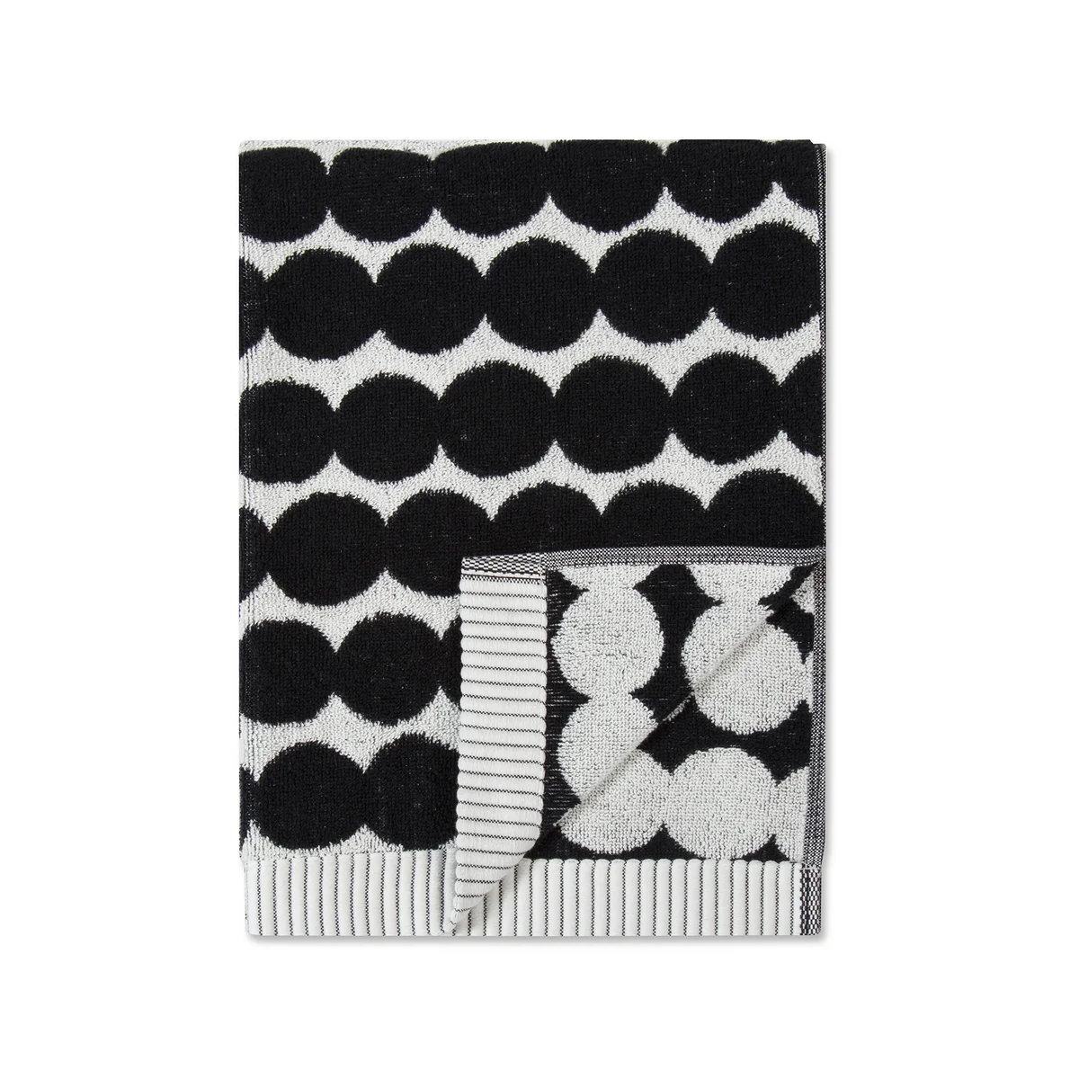De Räsymatto Marimekko handdoek is versierd met een stippen Räsymatto -patroon in verschillende kleuren. Het speelse motief is gecreëerd door ontwerpster Maija Louekari. Marimekko Het eenvoudige maar opvallende wereldberoemde patroon is perfect om structuur aan de handdoek te geven zonder de badkamer als geheel te overbelasten.